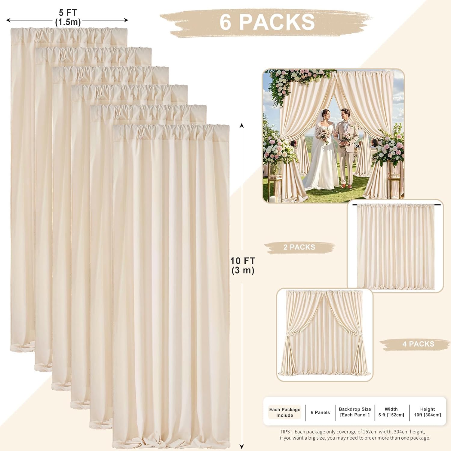 - Ivory Backdrop Curtains: Package including 6 panels 5ft width by 10ft height polyester backdrop covering a total area of 30ft width by 10ft height.Please allow errors of 0.1ft.