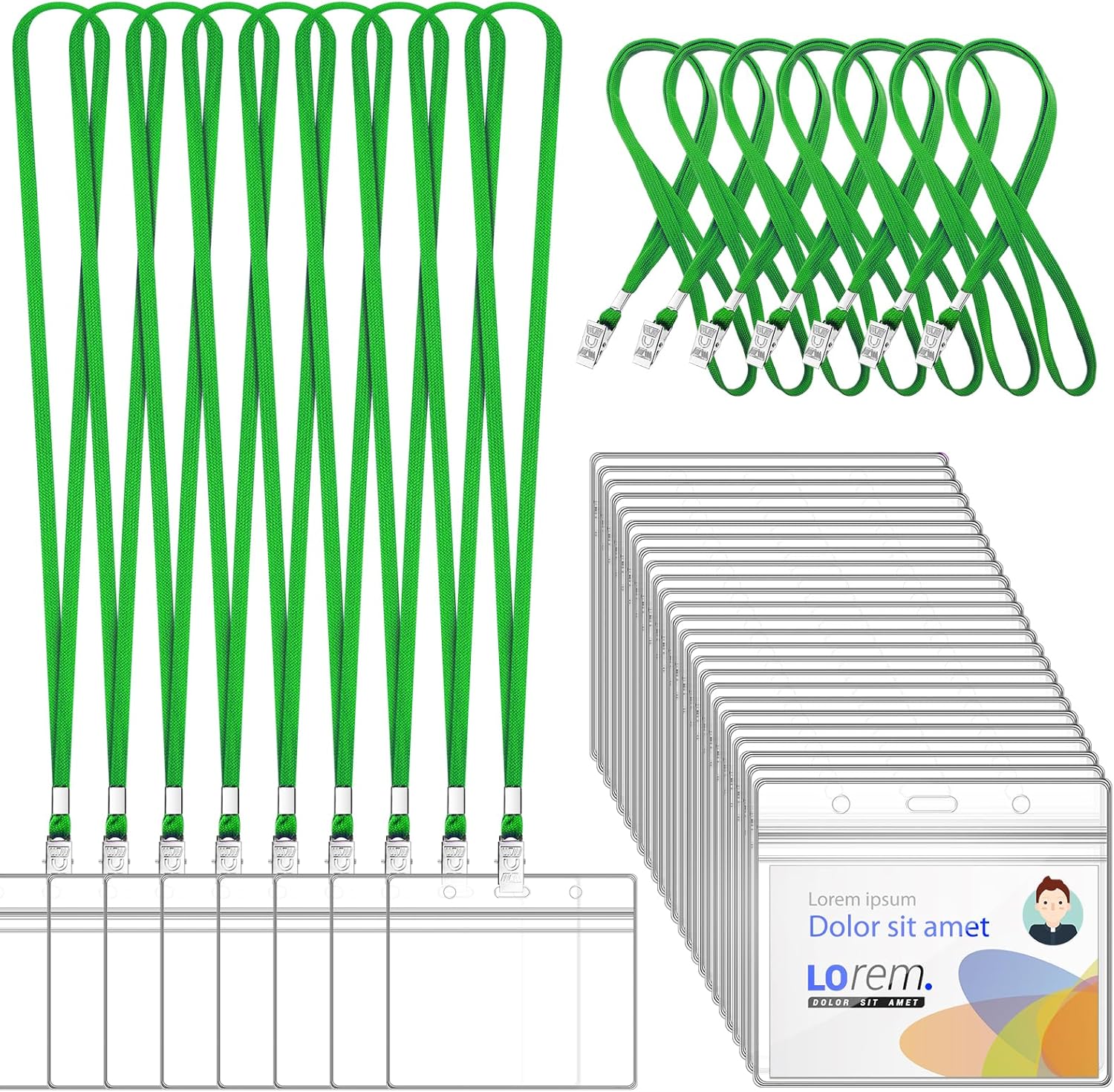 100Pcs Lanyards for ID Badges and 100 Pcs Clear Plastic Horizontal Name Badge ID Card Holders, Flat Neck Lanyards with Clip Waterproof Resealable Name Tag Badge ID Card Holders (Green)