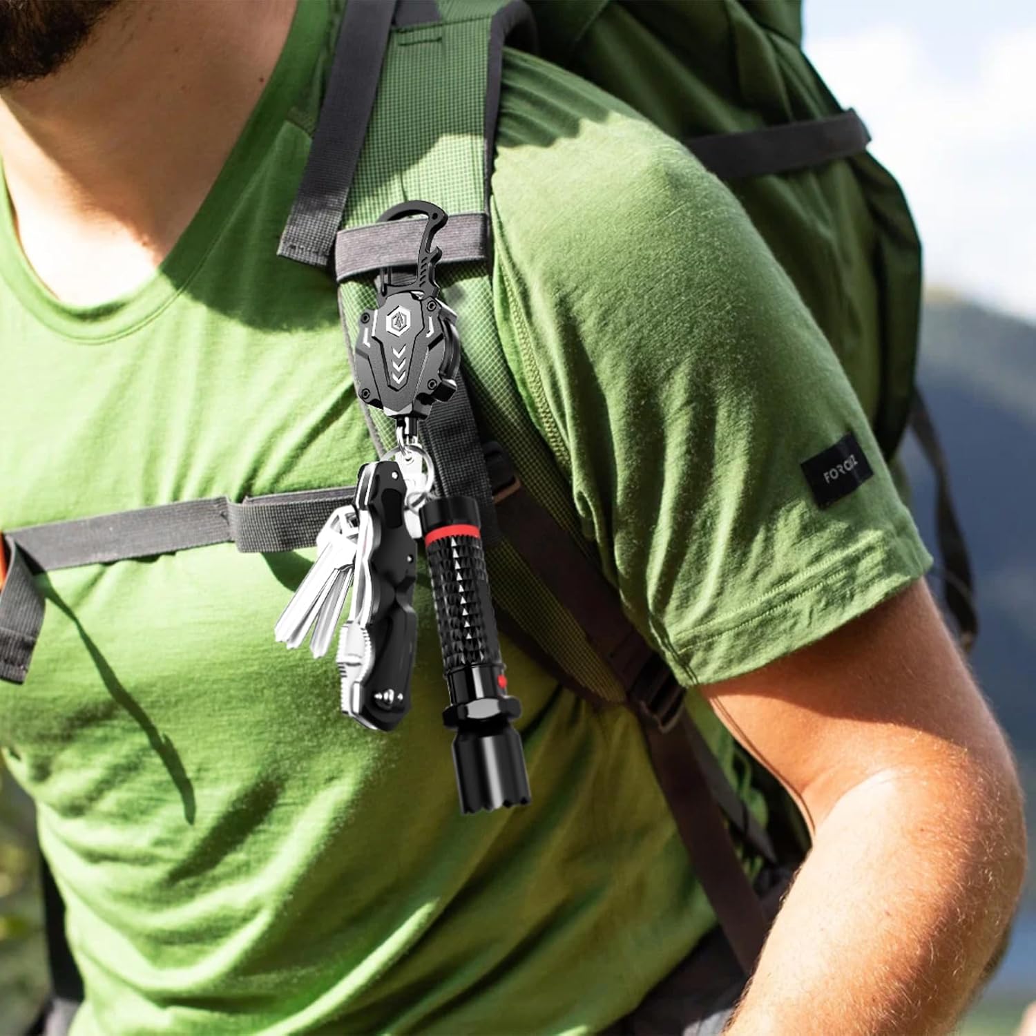 - [Multi-function tool] Cool tactical badge reel with key chain ring and ID badge clip not only can hang work ID name badge holder, keys, gadget buddy accessories, but also can help you open the beer cap smoothly. It can be fixed on belts, backpacks, handbags, outdoor tents. It also makes a great practical present for men, boyfriends, family, friends