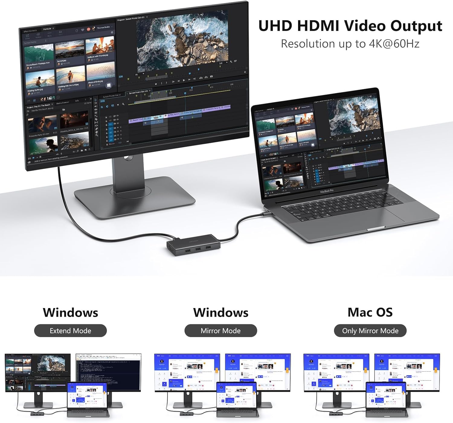 - Dual 4k Resolution Output: HDMI1/DP max up to 4K@60Hz, HDMI2 up to 4K@30Hz(work separately while source is DP1.4). When dual displays, HDMI1 or DP will be 4K@60Hz and HDMI2 up to 4K@59Hz(DP1.4). When using 2 hdmi+DP, HDMI1 up to 4K@59Hz, DP up to 4K@29Hz, HDMI2 up to 2K@60Hz(DP1.4).Display output will be 1080P when multiple monitor with VGA. Note!!! When using daul hdmi+DP, must follow the sequence or it will fail: Plug in HDMI1→Plug in DP(wait for the screen to display successfully)→Plug in HDMI2