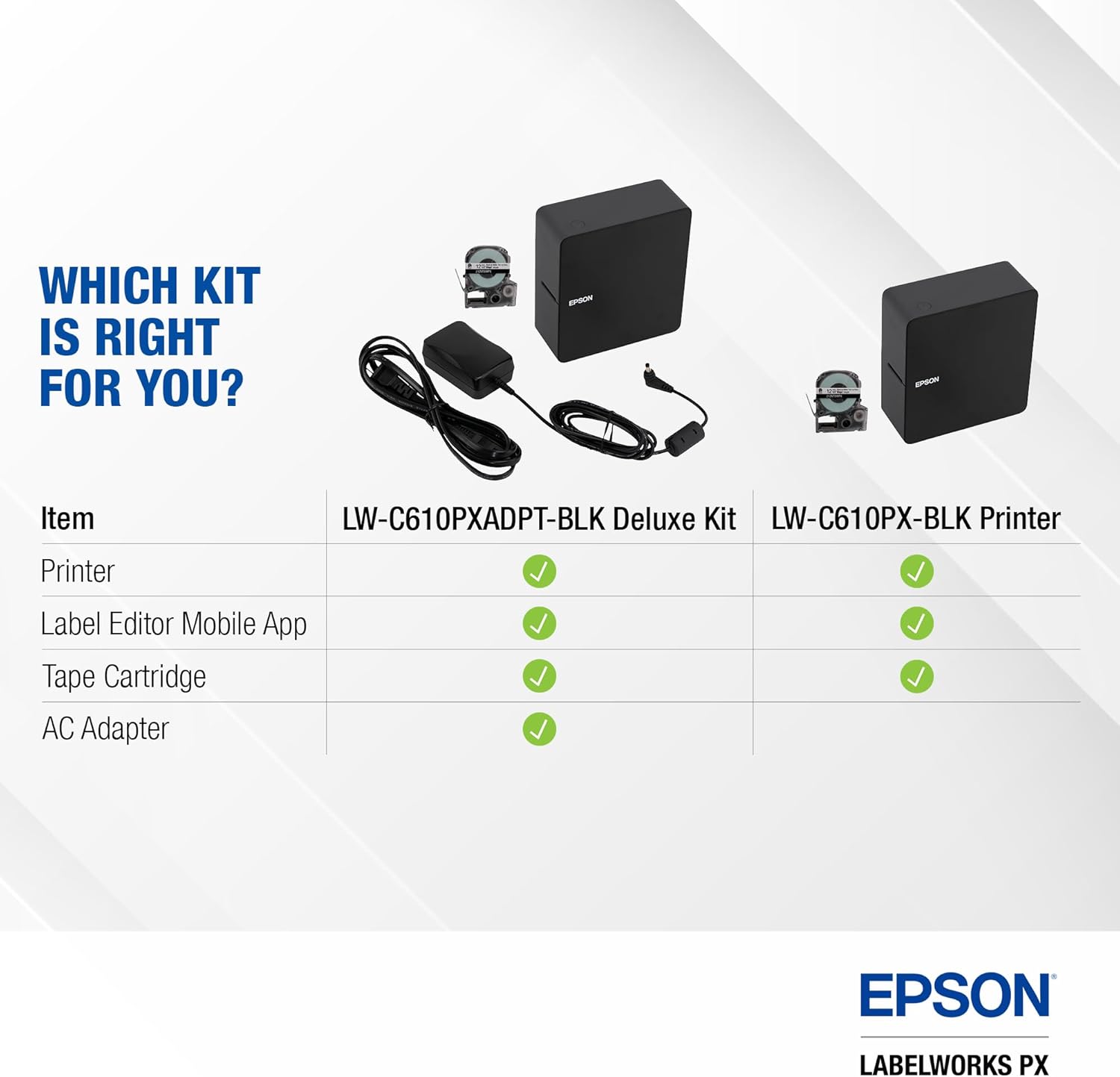 - PORTABLE - The wireless LW-C610PX label printer combines modern design with versatility, making it ideal for crafts, home organization, and office tasks. Its sleek and compact build allows it to fit seamlessly into any space. Use Epson’s free Label Editor Mobile app to wirelessly create and print personalized labels with your favorite fonts, images, and more. Operates on AA batteries (not included) or with an AC power adapter (sold separately).