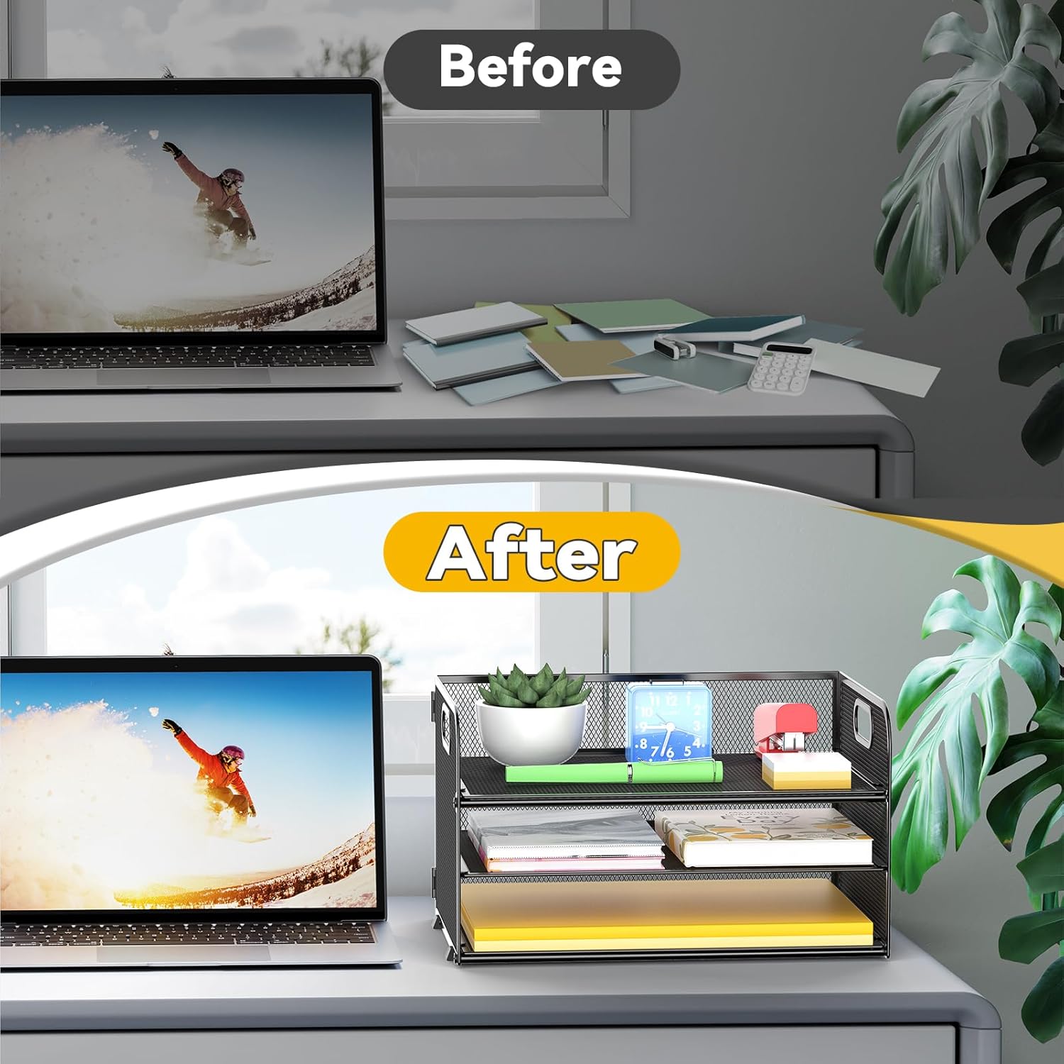 3 Tier Paper Organizer Tray with Handle, Mesh Letter Tray for Office, Home, School (1 Pack), Black
