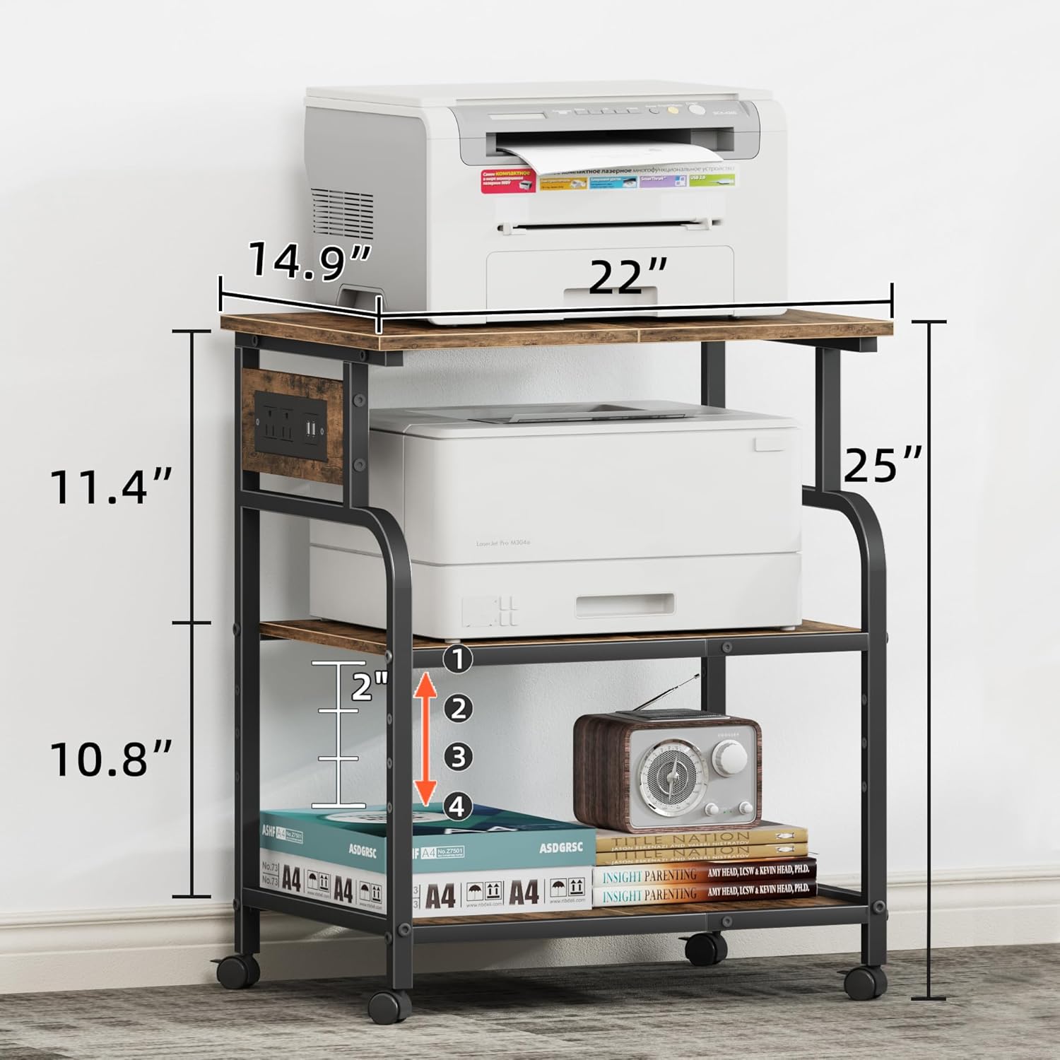 3 Tier Large Printer Stand with Power Outlet/Adjustable Storage Shelf, Rolling Cart with Wheels, Printer Table for Home Office 3D Printer/Heat Press/Laster, 22"×15" Rustic Brown