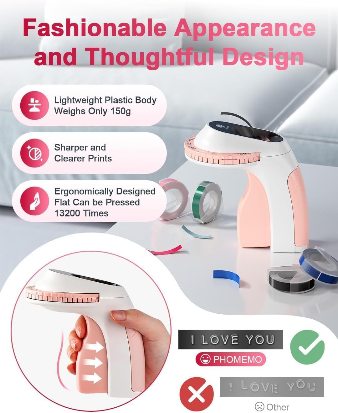 Phomemo Embossing Label Maker Machine, Retro Embossed Label Maker, Old School Embosser Labeler with 6 Rolls 3D Embossing Label Waterproof for Kid DIY Home School Supplies Office Organization, Pink