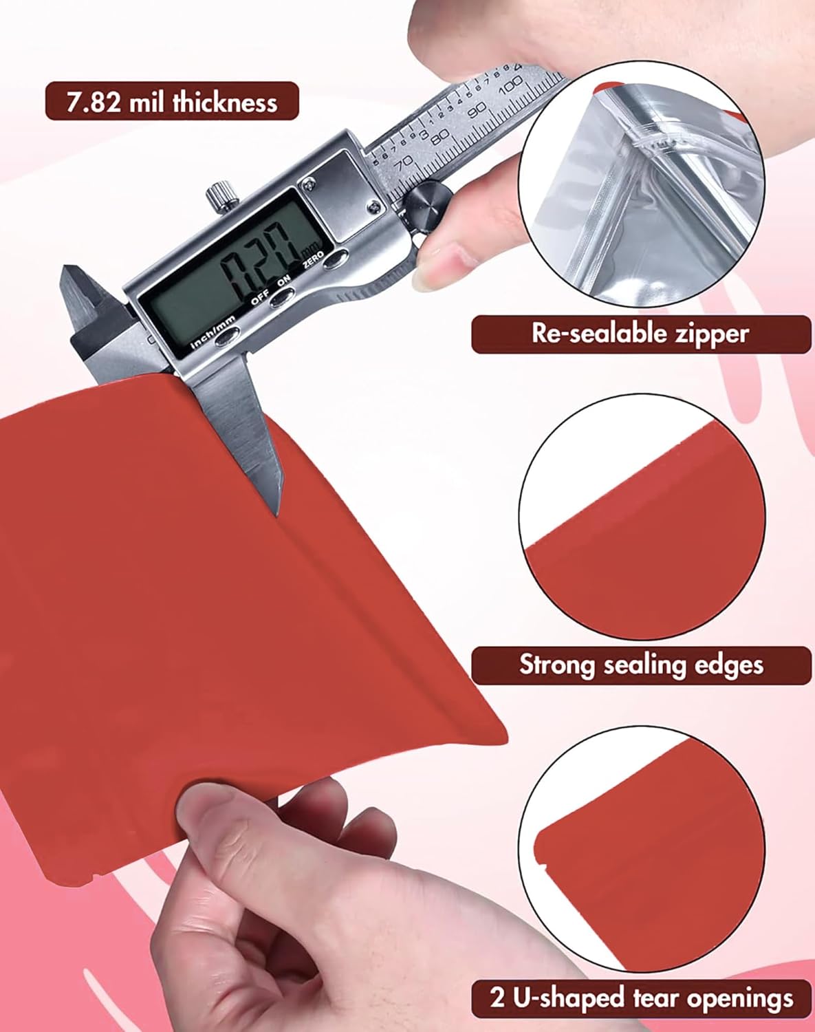 - Premium Quality Sealable Bags: Perfect resealable bags for food stronger with thick barrier layer, matte color surface and aluminum foil interior enhance the durability and aesthetics of the smell proof bags. The resealable zipper is strong enough and won't pop open to ensure the food is safe inside