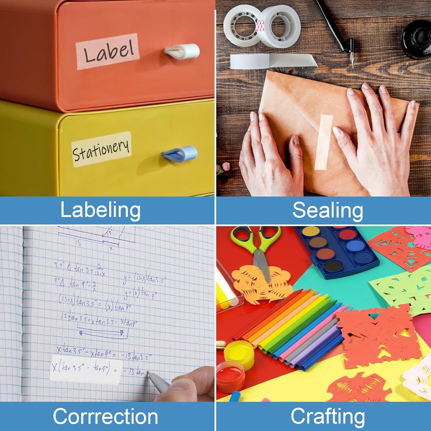 - WIDELY USAGE: Clear tape rolls is a versatile tool in offices, schools, and everyday life. The labeling tape can be used not only to mending documents or photos, but also for gift wrapping, crafting, sticking photos, sealing envelopes, and many other items.
