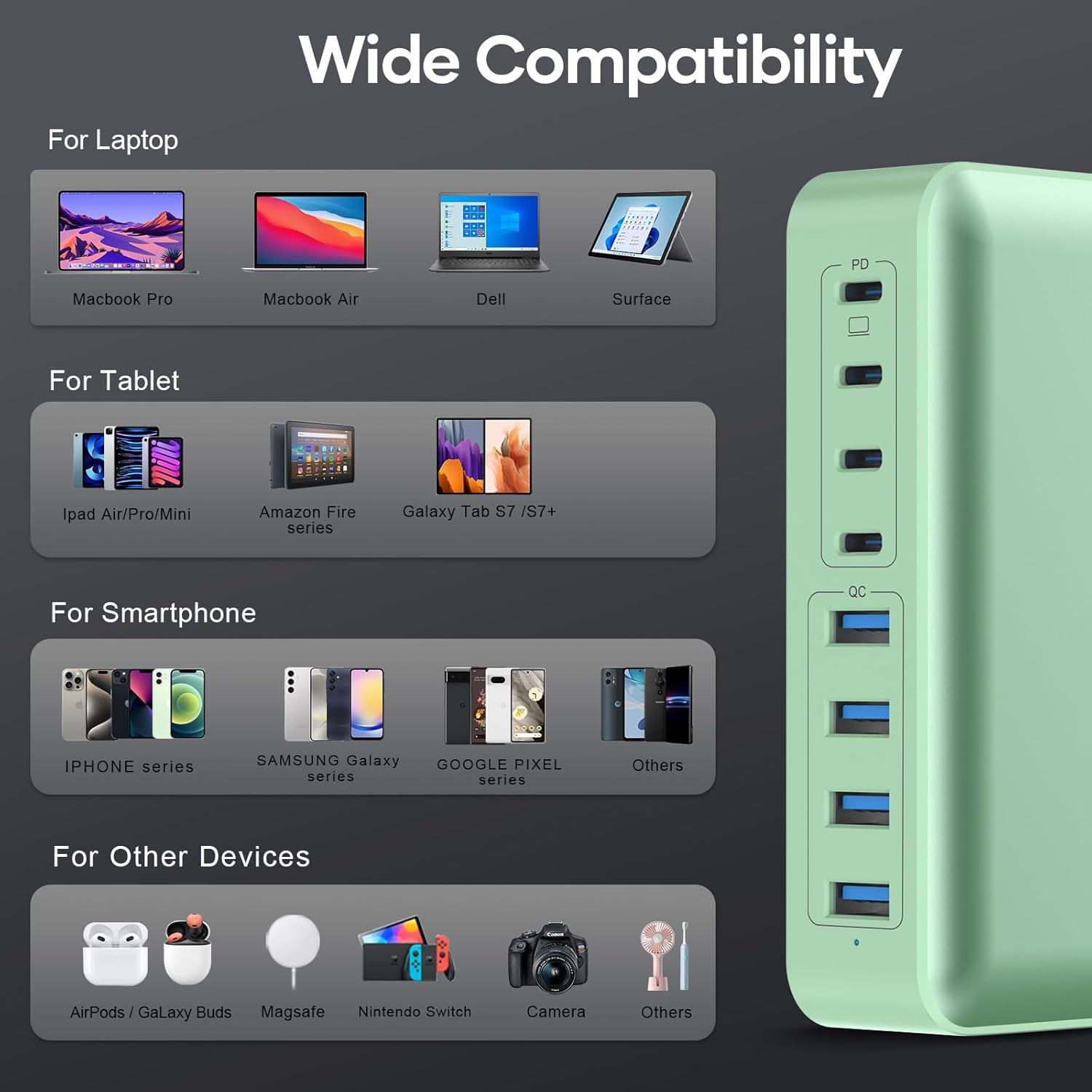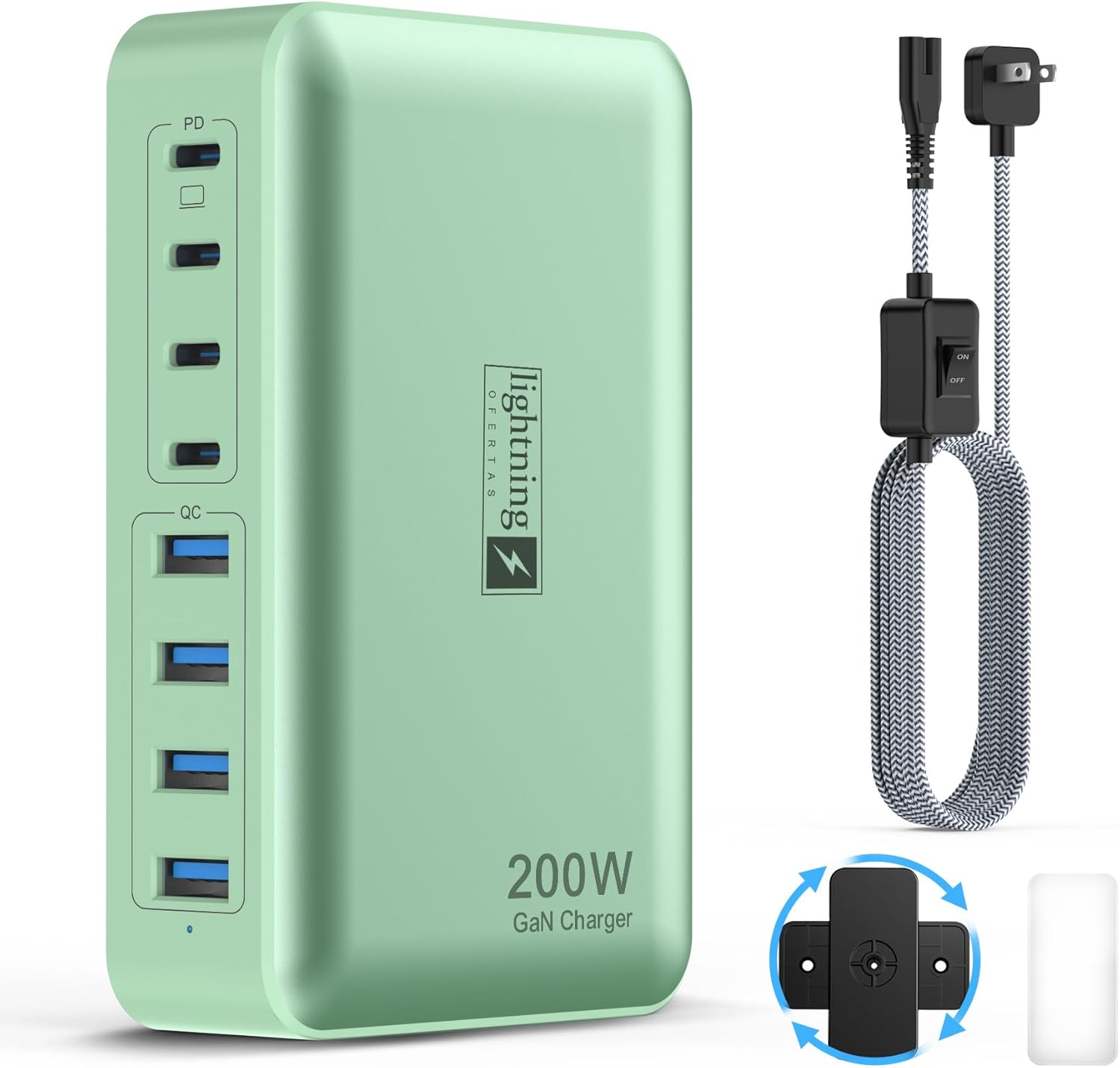 - Powerful 200W GAN charger with USB-C and USB ports, compatible with Apple, Samsung, and other devices.