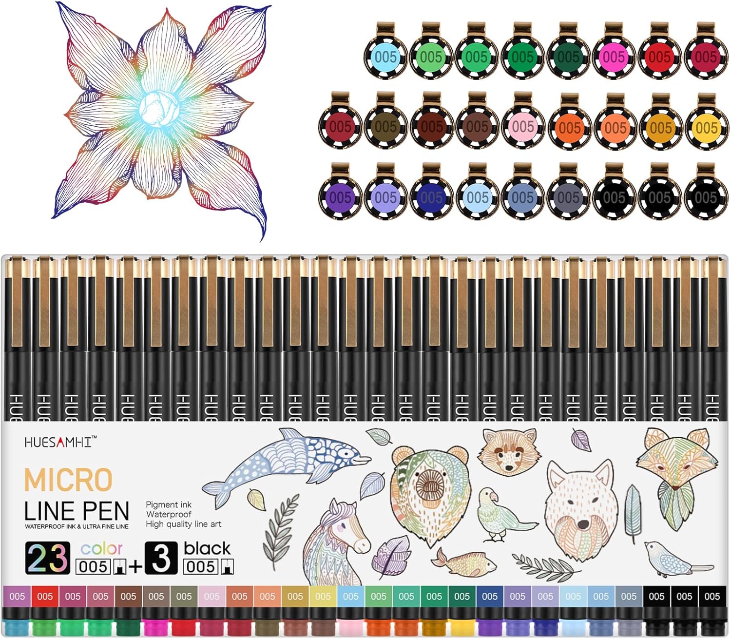 005 Micro Pen 23 Colors and 3 Black 0.20mm Fine Tip Waterproof Ink FineLiner Pens for Art Illustration Sketching, Anime Bullet Journal and Technical Drawing