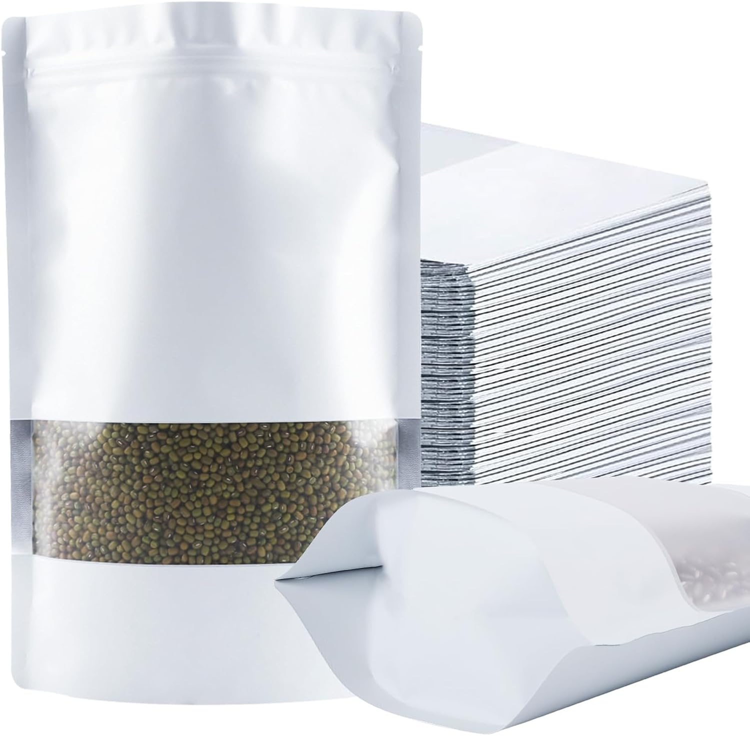 100 Pack Smell Proof Bags, Resealable White Mylar Bags with Matte Window, Foil Pouch Stand Up Sealable Bags for Packaging, 6.29 × 9.44 Inch