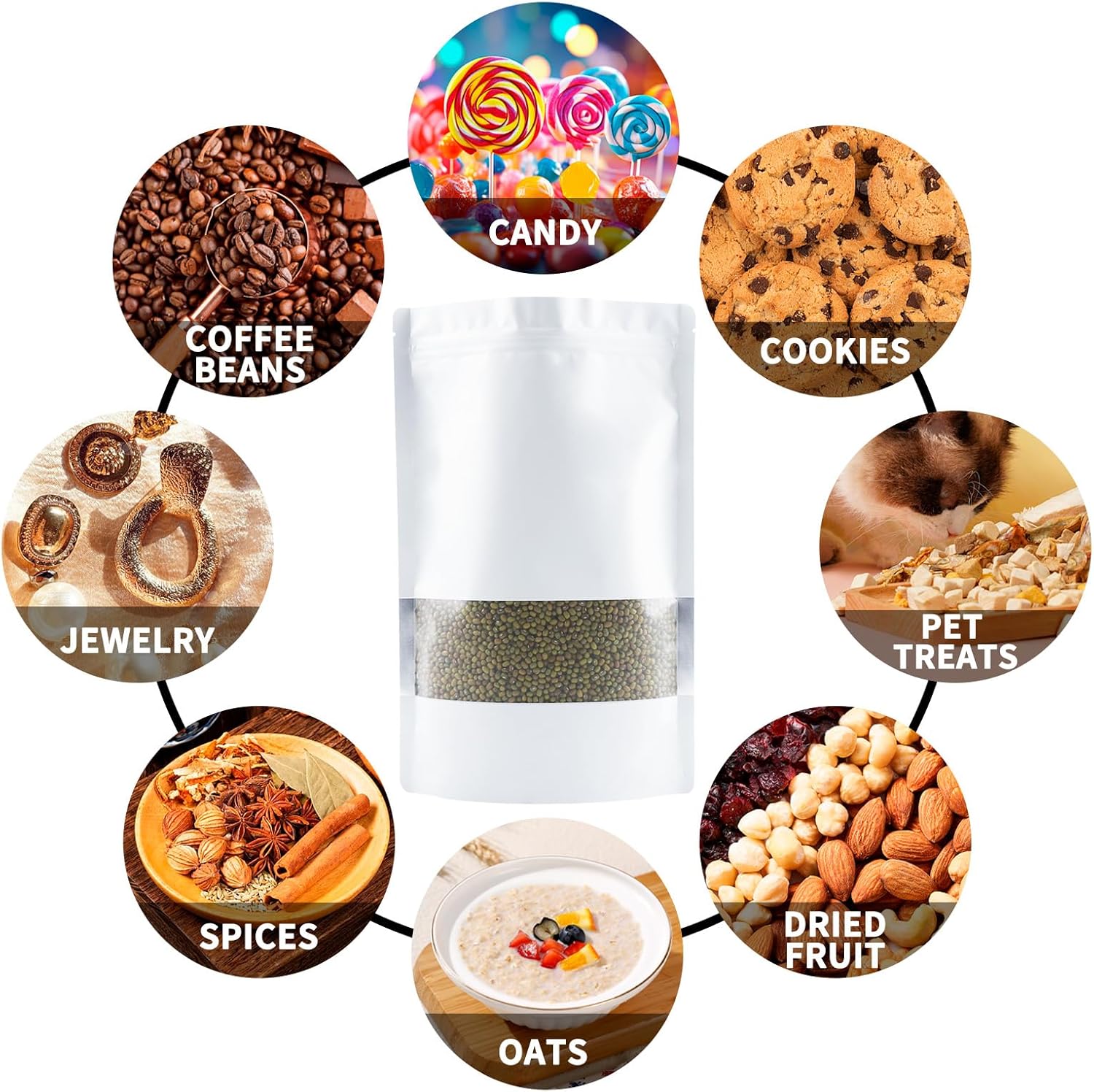 100 Pack Smell Proof Bags, Resealable White Mylar Bags with Matte Window, Foil Pouch Stand Up Sealable Bags for Packaging, 4.72 × 7.87 Inch
