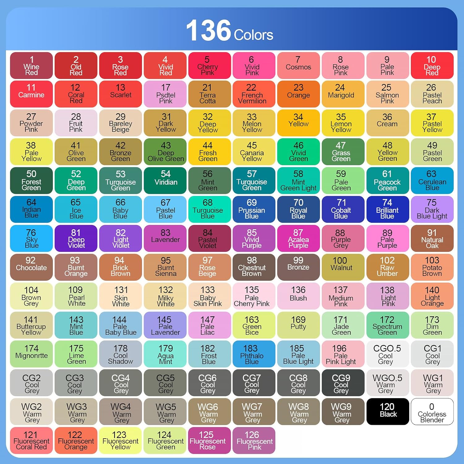 - 【136 VIBRANT COLORS】136 colors unique art marker pens bring your art to life, multiple choices, standard colors on the pen, new color system, no deviation, natural transition, natural color overlap, outstanding effect, bright color, easy to blend. Whether it's a coloring book or a masterpiece in the making, your artwork is sure to shine with these brush markers. Great as art markers, sketch markers, permanent markers, alcohol based markers, paint markers.