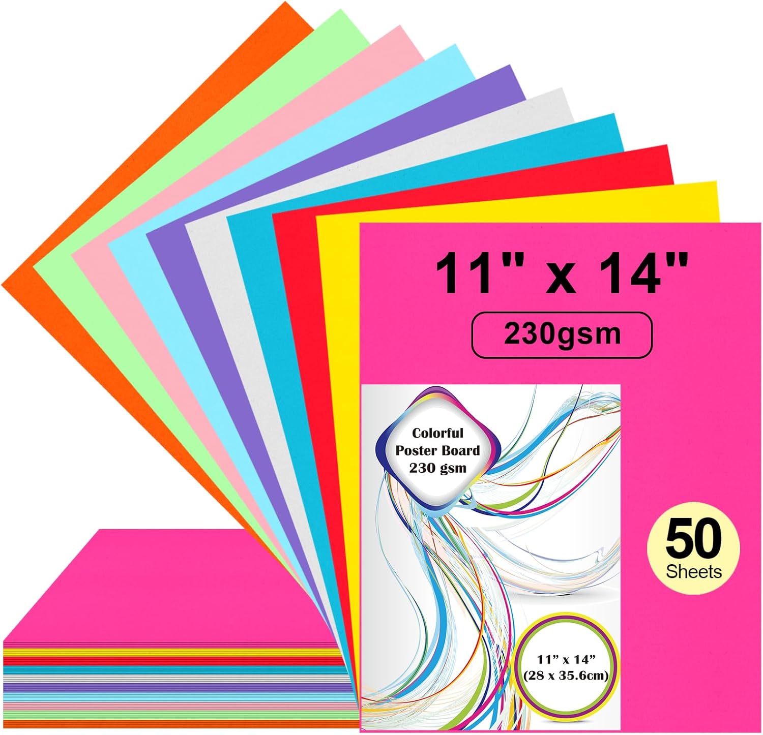 50 Pcs 11" x 14" Colored Poster Board Paper ROOKEA Colorful Poster Board Bulk 230 Gsm Thick Vision Boards Blank Smart PosterBoard for School Arts Craft Projects Drawing Scrapbooking Graphic