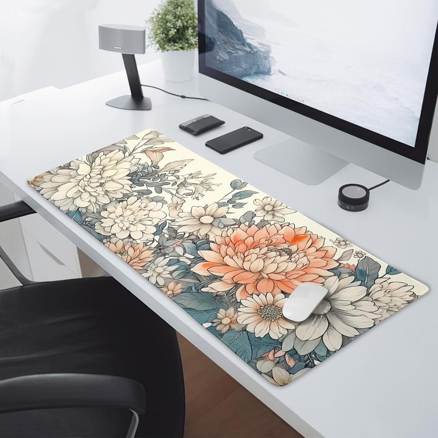 Japanese Aesthetic Floral Gaming Mouse Pad XXL Vintage Orange White Flowers Extended Large Mat Mousepad Desk Pad Non-Slip Rubber Base Stitched Edge Keyboard Pad Playmat for Computer,35.4×15.7 Inch
