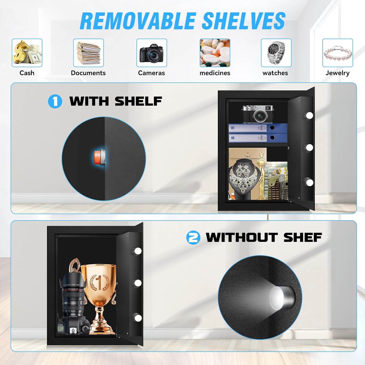 - ăREMOVABLE SHELVESă: This fire safety boxes for home, featuring removable shelves, can accommodate a wide range of items, including documents, cash, jewelry, and electronics, thus enhancing its practicality. Moreover, the removable shelves simplify the cleaning of the safe's interior, as they can be removed and cleaned individually. This ensures improved hygiene and better care for the stored items