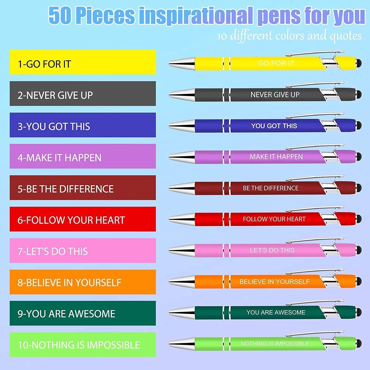 - Quotes That Ignite - Each inspirational pen bears an empowering phrase like "GO FOR IT", "NEVER GIVE UP", igniting your drive. These colorful, stylus-tipped cute pens crafted from premium materials will fuel your spirit for years to come.