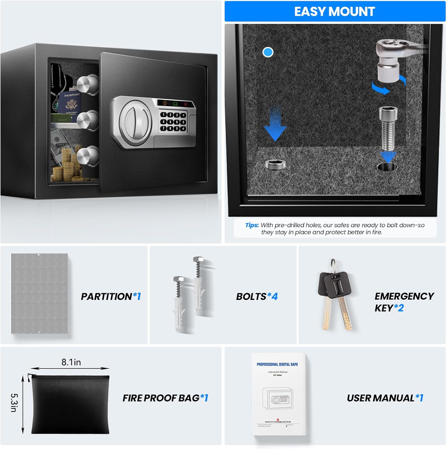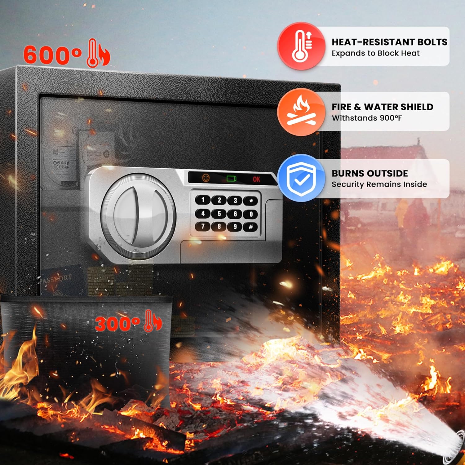 - 【Secure Shipping, Smarter Setup】Each safe ships in a 24 in (60 cm) drop-tested box with 2 in (5 cm) foam-corner protection—engineered to absorb shocks, prevent dents, and avoid paint scratches from rough handling. Once unboxed, bolt the safe to the wall or floor through the pre-drilled holes. This not only deters theft, but also reinforces the door seal—unlocking the safe’s full fire, water, and impact resistance. Backed by a one-year warranty and lifetime customer support.