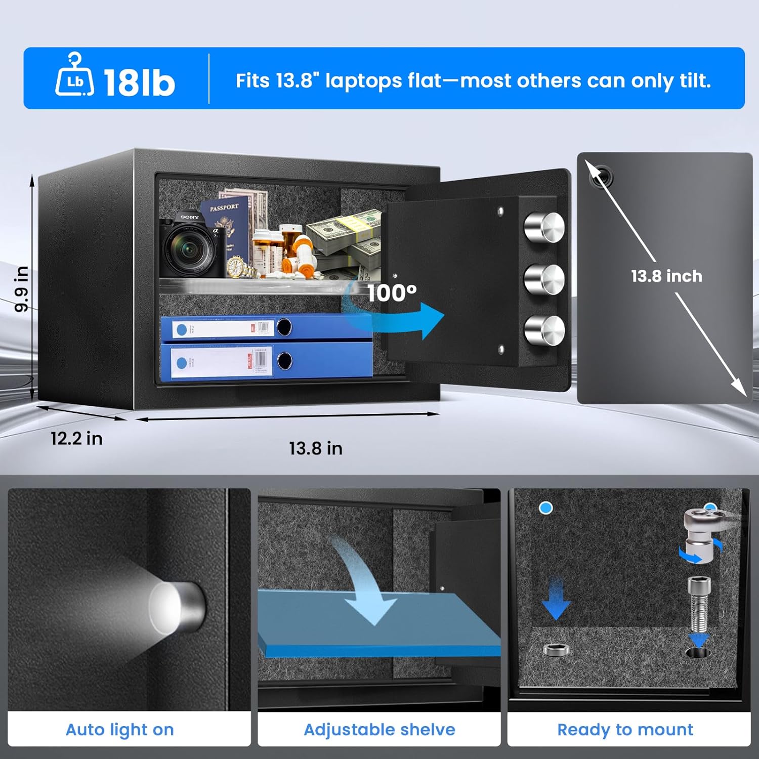 - 【Flat-Lay Letter-Size Storage 】Internal dimensions of 13.2 × 9.8 × 10 in (33.5 × 25 × 25.3 cm) let you store standard letter-size documents completely flat. The removable shelf holds up to 22 lb (10 kg), so you can organize cash, passports or small electronics with ease.