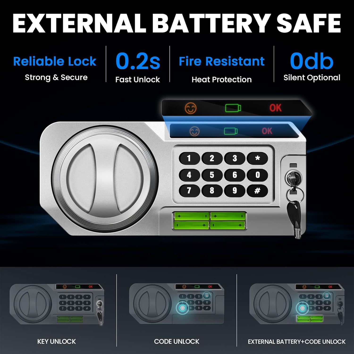 - 【Smart Digital Lock with External Battery Compartment & 6-Month Runtime】Program a 4–6-digit code, stow your backup key inside, and power the lock with any standard 9 V battery (not included). If your primary battery dies—or you misplace the backup key—the external battery compartment lets you pop in a fresh battery without opening the safe. Enjoy up to six months of runtime on a single battery, plus a low-battery panel alert when it’s time to swap. Three wrong code entries trigger a 60 dB alarm (about the volume of normal conversation), or switch to silent mode for discretion.