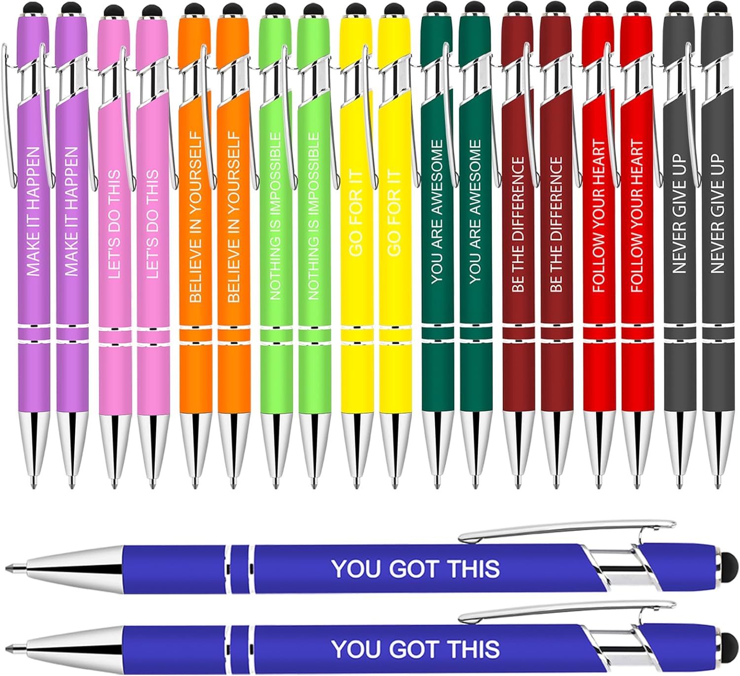 - Quotes That Ignite - Each encouraging pen bears an empowering phrase like "GO FOR IT", "NEVER GIVE UP", igniting your drive. These colorful, stylus-tipped cute pens crafted from premium materials will fuel your spirit for years to come.