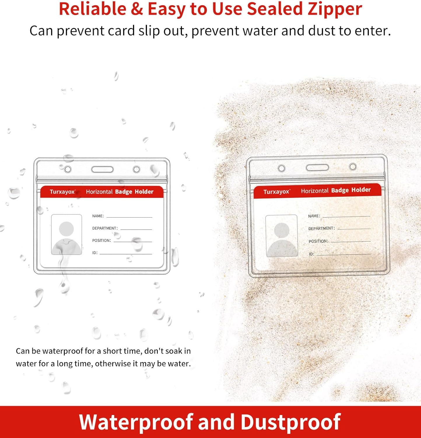 - Flexible Multi-purpose Design: Our clear ID card holder features a resealable zip, making it waterproof and dustproof, ensuring the safety and dryness of your cards and money. The dual-use hanging slot/holes design allows you to easily attach a badge lanyard, keychain, or retractable carabiner reel clip. The side holes can be used for attaching a strap, cord, string, or thread.