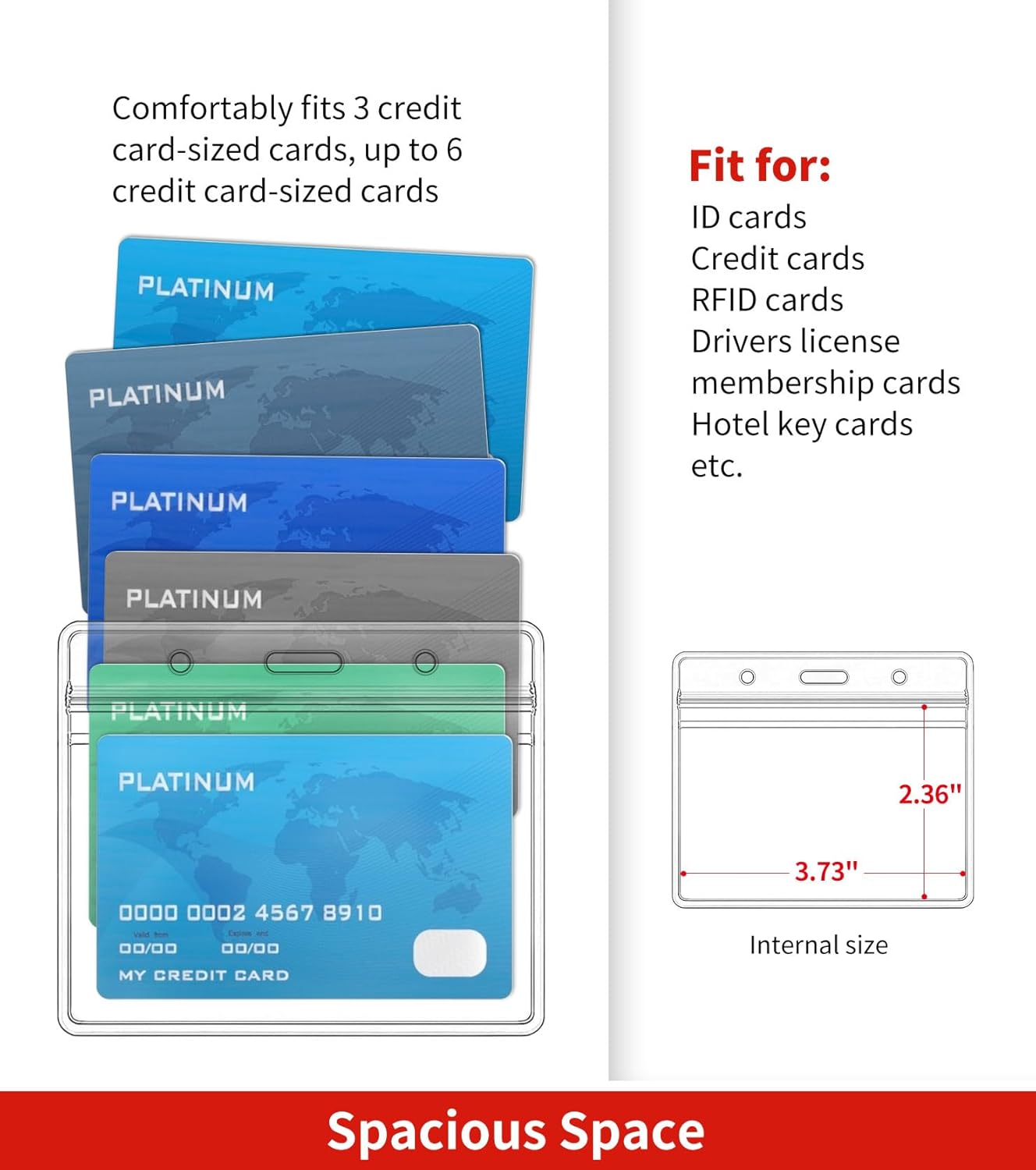 - Large and Spacious Space: Our badge holder has external dimensions of 3.94" L x 3.35" W, with available internal dimensions of 3.73" L x 2.36" W. It can hold up to approximately 6 credit card-size cards. Perfect for organizing your cards.