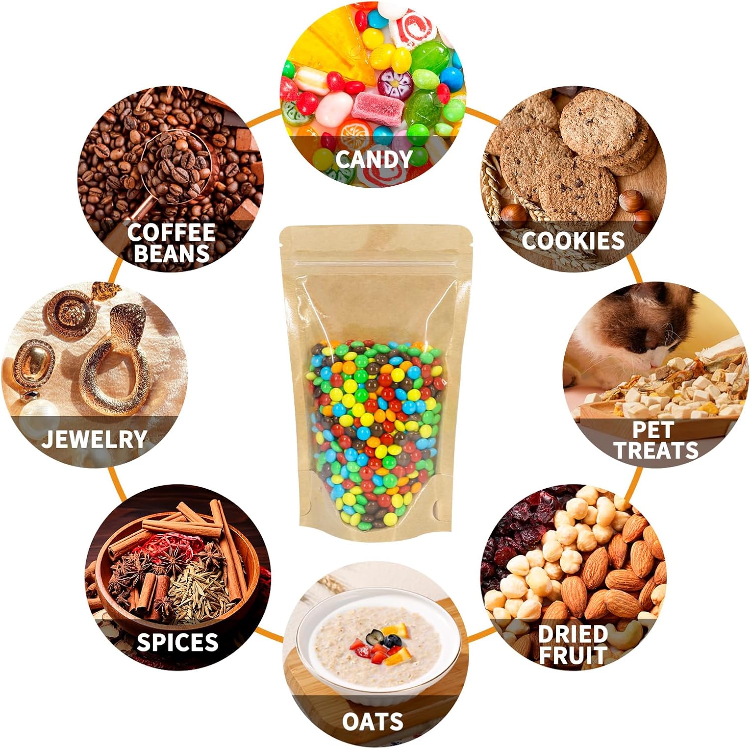 - Wide Applications: The resealable food pouches can be used to store bath salt, nuts, oats, cookies, candy, coffee beans, wax melt, grain, pet food, spices, bath bombs and so on