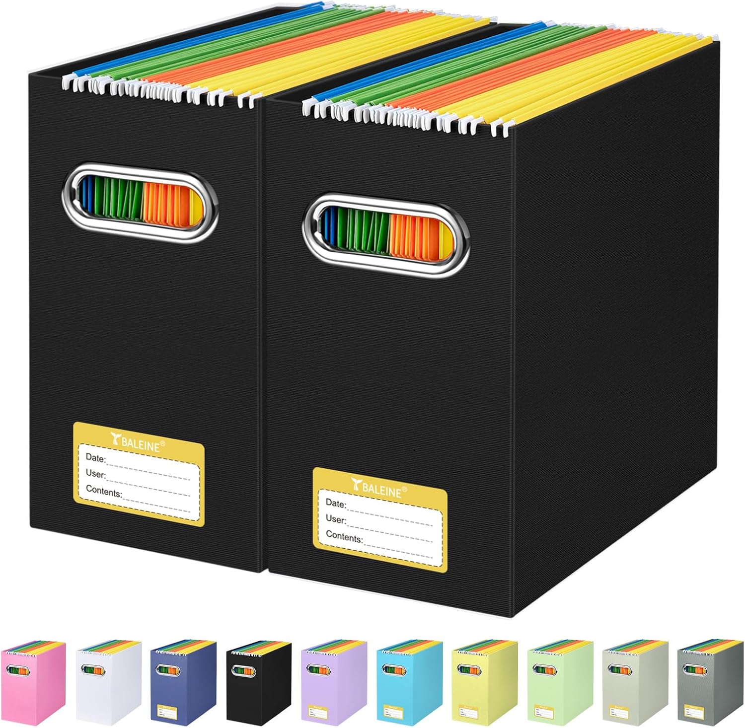 BALEINE File Organizer Box, Cardboard File Folder Organizer with Handle for Letter Size, Portable Collapsible Hanging Filing Box for Home Office Document Storage (2 Pack, Black)