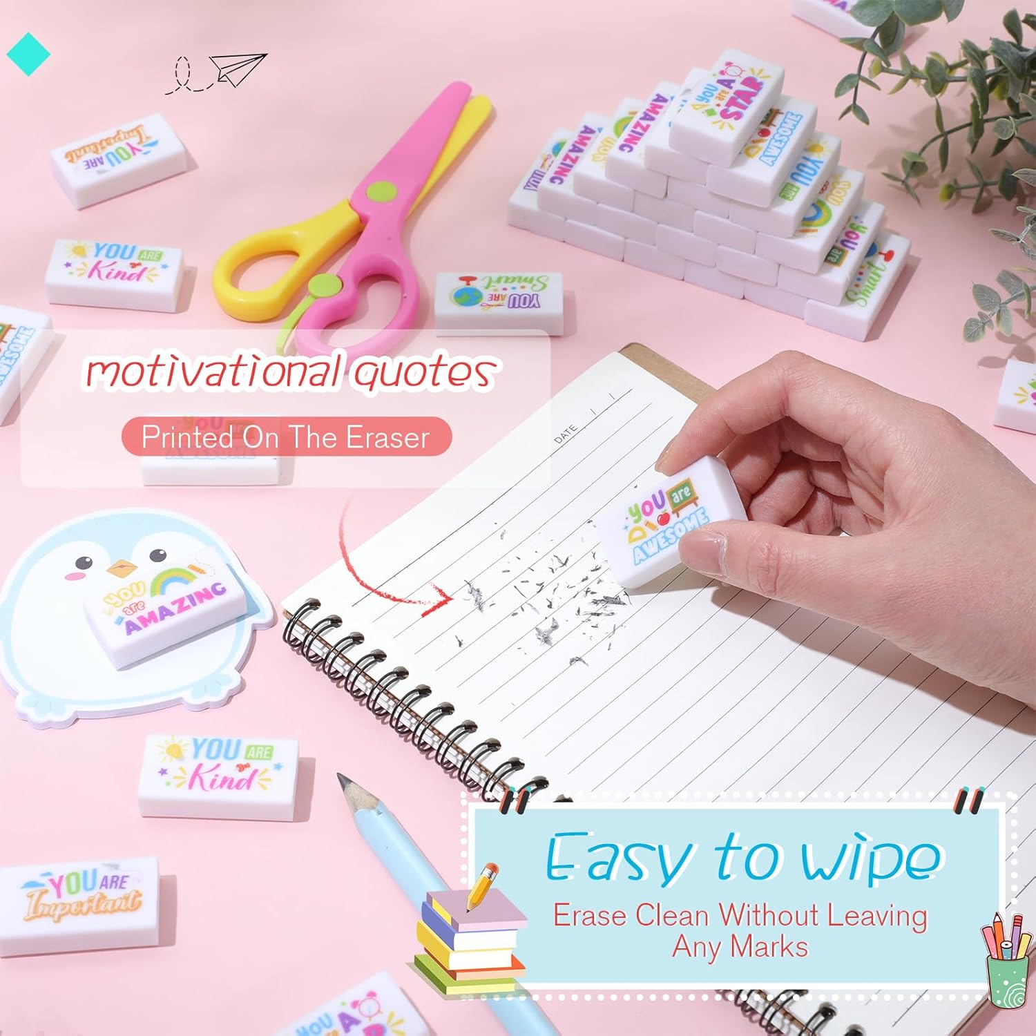 - Inspirational Features: what sets our drawing eraser apart is the printed inspirational cute words on each item; Using these erasers not only helps you to correct mistakes, but also serves as a constant reminder to stay motivated, making every writing or drawing session inspiring and fun filled