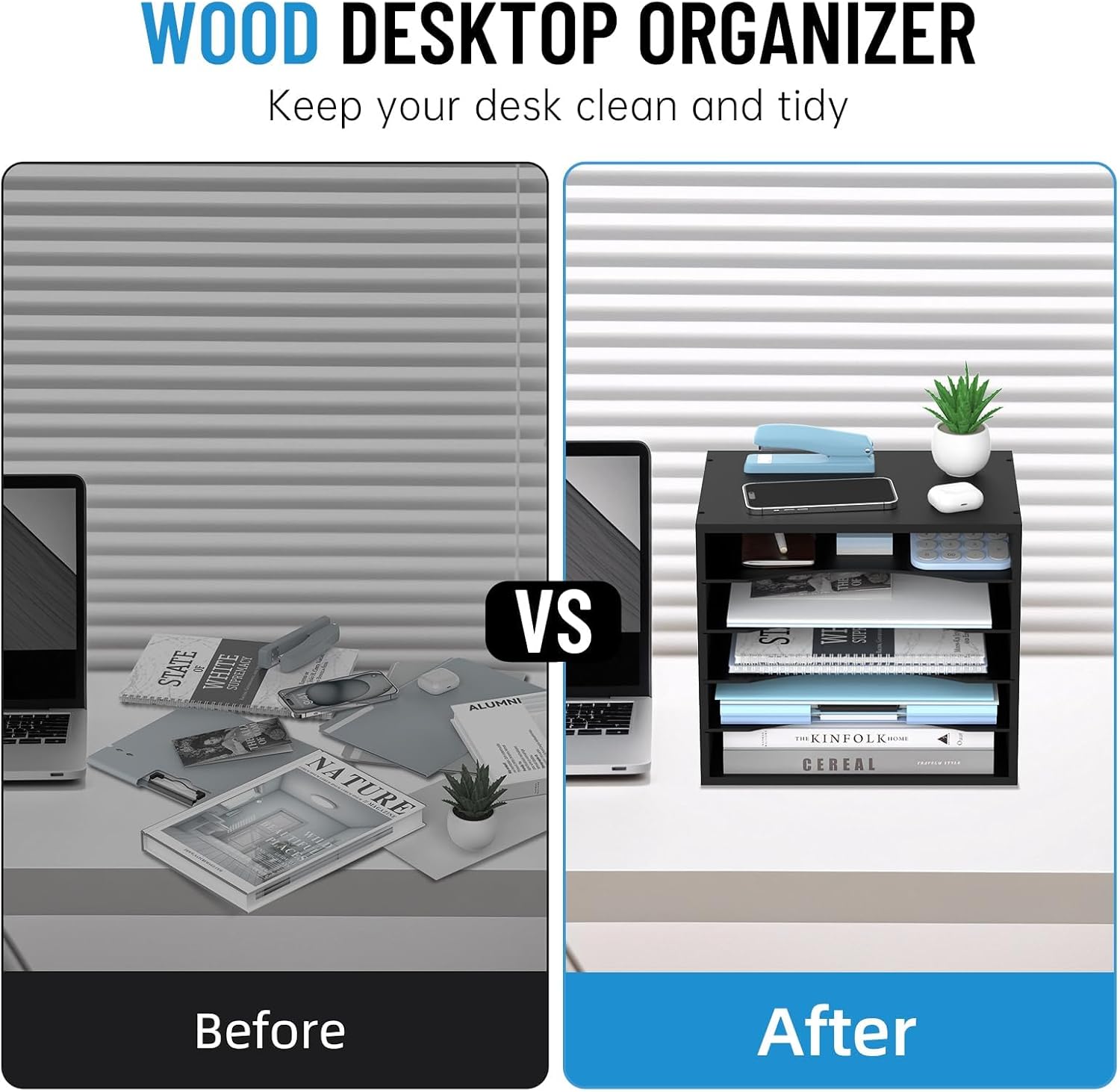 - [Versatile Paper Organizer] Sharkwoods upgrade desktop file sorter features 5 storage space, perfectly fitting letter size documents with a shelves depth of 8.5 inches. You will have ample space by using 5 trays to organize folders, mails, craft paper and other office essentials.