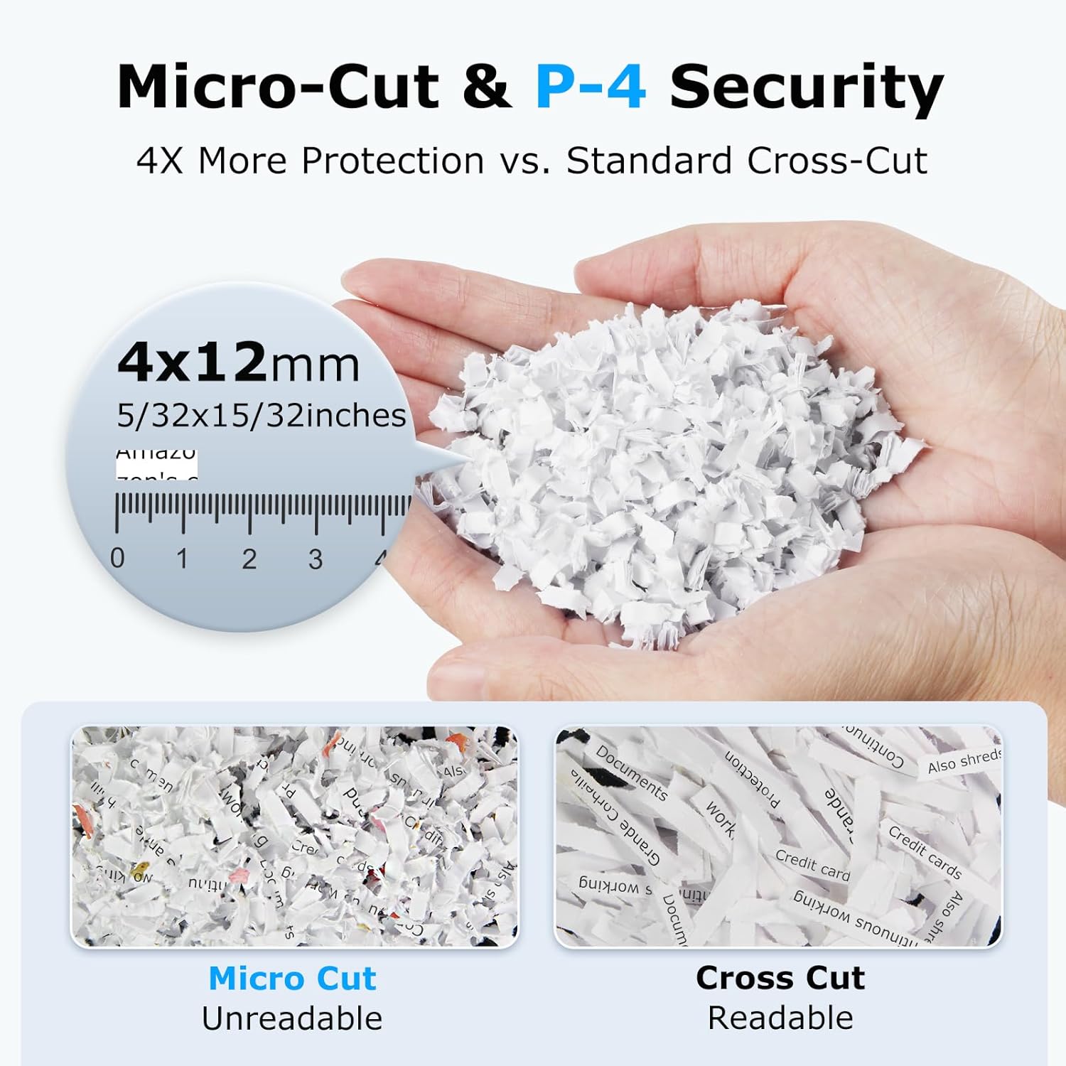 - High Security P-4 Level: Micro-cut turns paper into tiny pieces measuring 5/32" x 15/32" (4 x 12 mm), greatly protecting your privacy.