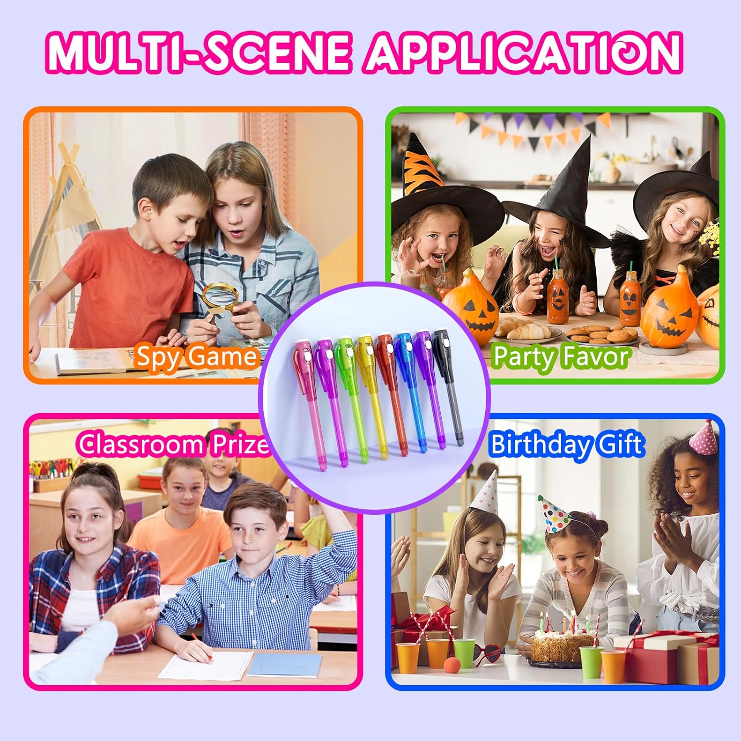 - đ¨ăCreative Invisible Ink PenăElevate your for little adventurers providing a safe and enjoyable experience with this amazing invisible ink pen! Kids can play games like escape room, hidden treasure, riddles, detective games, skin tattoos. Write their secret messages on paper using this magic pen, which can only be discovered by shining the pen's UV light on them! Give your child and their friends a unique and exciting experience with the party favors!