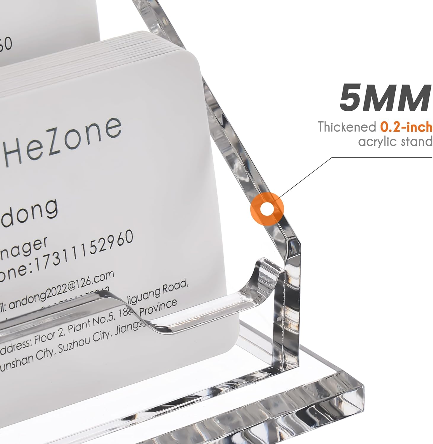 - STURDY BUSINESS CARD HOLDER:Our business card organizer size is 4.72"L x 4.33"W x 4.33"H,8mm(0.3 inches) thickened base,5mm(0.2 inches) thickness acrylic material. Weight: 0.7 lb.Good quality thickened acrylic name card holder, crystal texture ,sturdy and durable, smooth edges, no hand injury, integrated,no assembly required,easy to clean