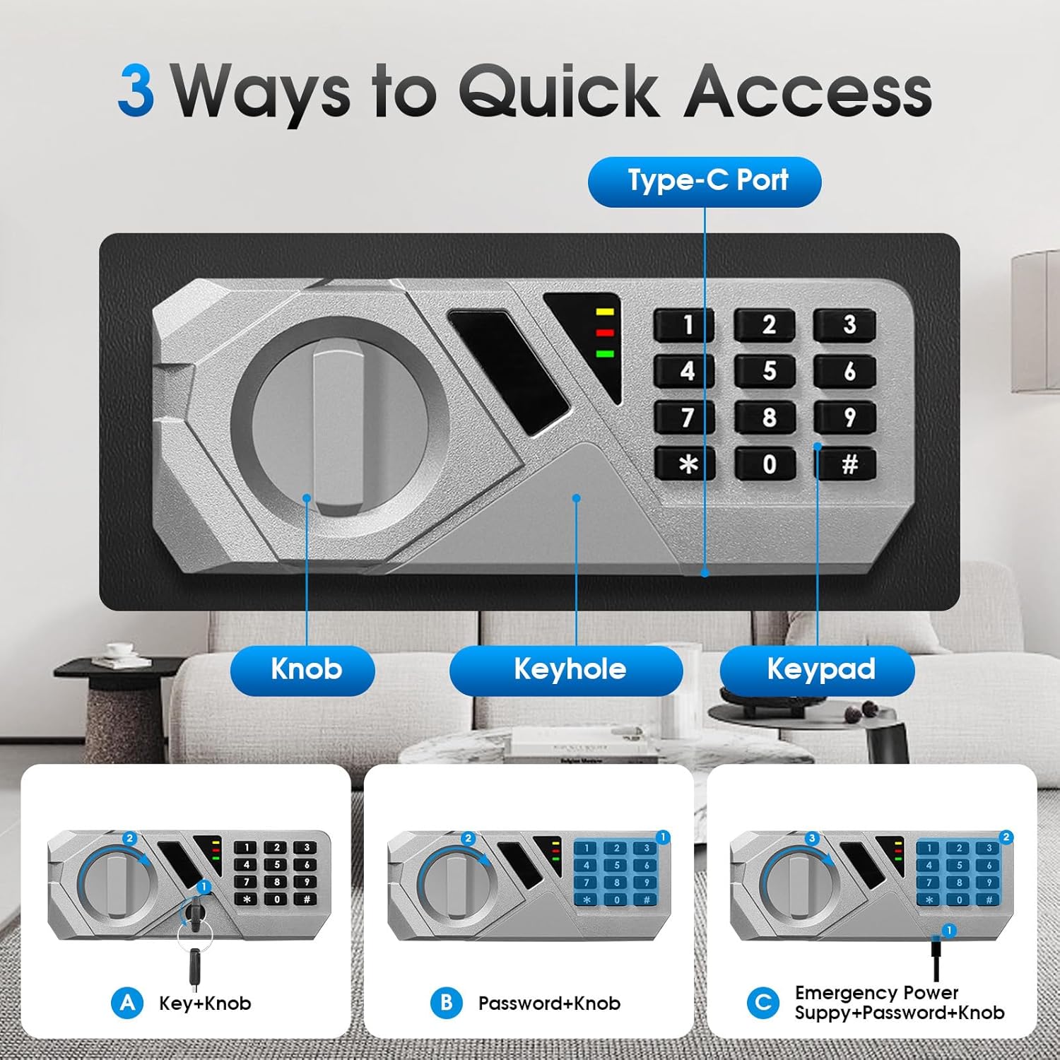 - ăAnti-Theft Alarm System & Mute FunctionăThe highly sensitive alarm system in this home safe is your vigilant guardian. Just 3 incorrect password entries prompt a blaring alarm and a 30-second lockout, while 6 wrong tries lead to a 5-minute lockdown. And when needed, the optional mute mode offers discreet security.