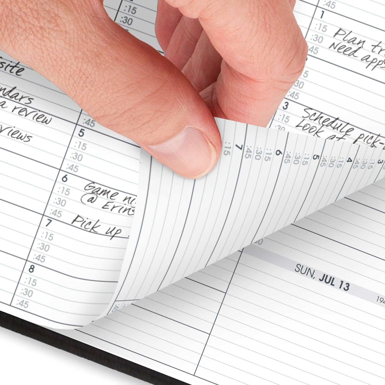 - PROFESSIONAL DESIGN – Take charge of your schedule with classic style. Planner has a black faux leather cover and twin wire binding to help prevent snags and secure pages.