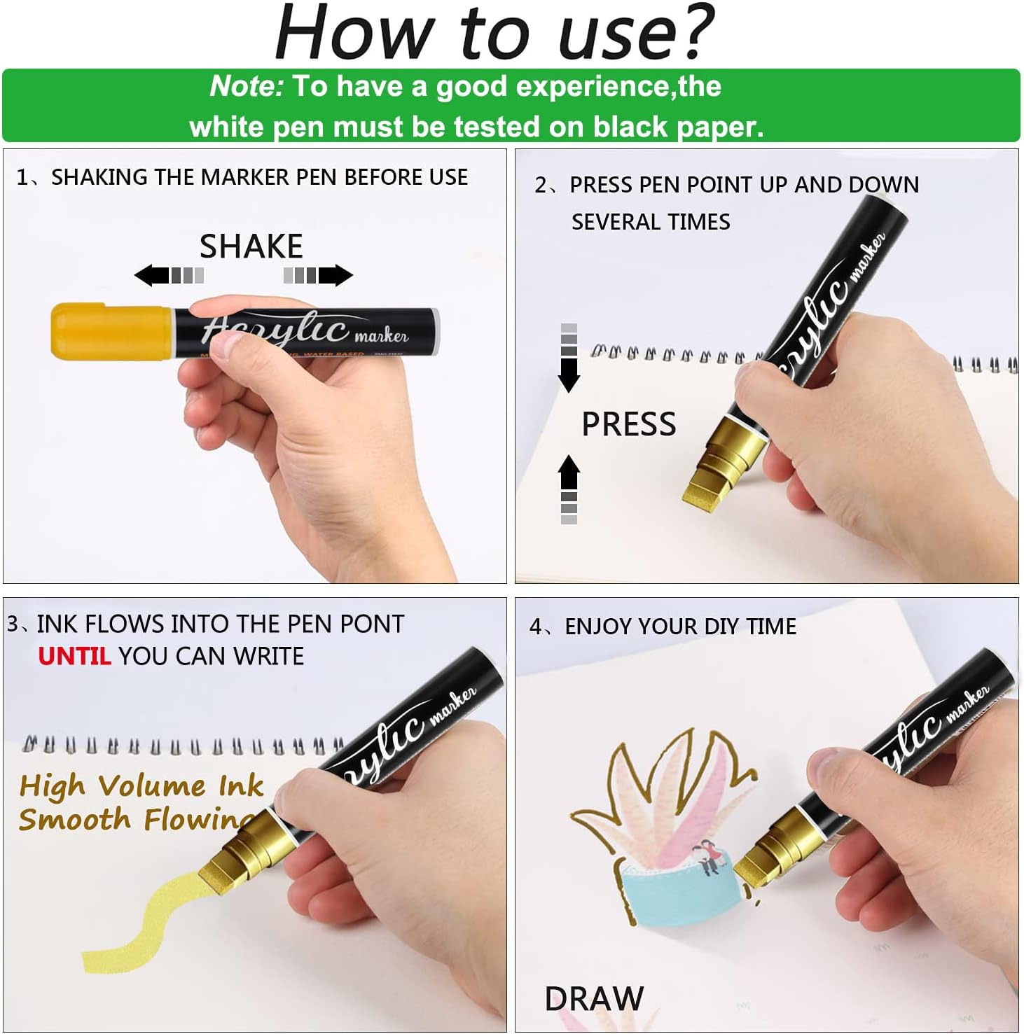 - Paint Markers : Acrylic Paint Pens with high capacity ink, Up to 2X longer life. The Water-Based Acrylic Paint Markers Ideal for arts and craft projects,as well as adding permanent identification marks for metal tools, parts and other industrial applications.Notes: WaterProof After Baking!For permanent results, need to bake for half an hour.