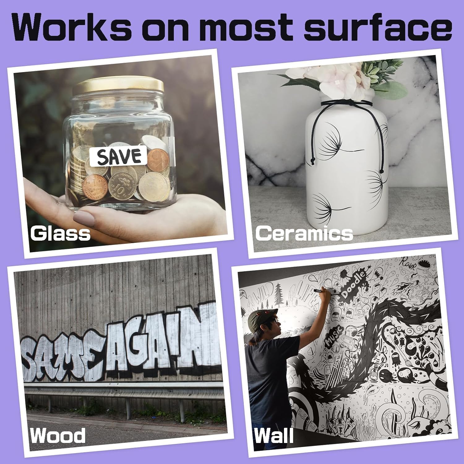 - Versatile Multi-Surface Use: Achieve picture-perfect artwork on nearly any surface with these versatile markers. Whether you're working on posters, DIY projects, or other creative endeavors, these acrylic paint markers excel on surfaces such as walls, stone, ceramic, glass, wood, fabric, canvas, plastic, textiles, metal, resin, terracotta, seashells, polymer clay, vinyl, leather, and more.