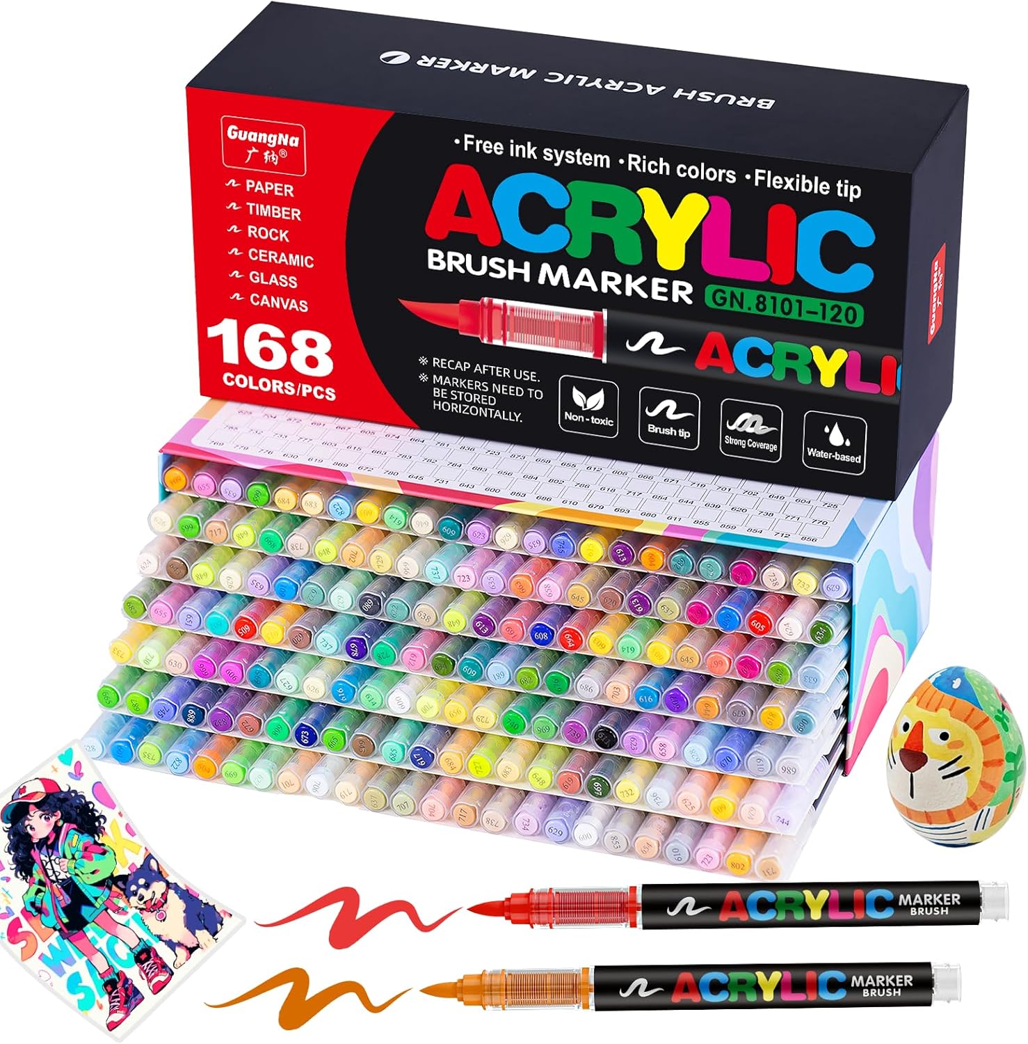 JRQ 168 Colors Acrylic Paint Markers, Brush Tip Acrylic Paint Pens for Wood Rock Glass Canvas Stone Fabric Glass Metal Ceramic Canvas DIY Crafts Art Supplies Kids Gifts