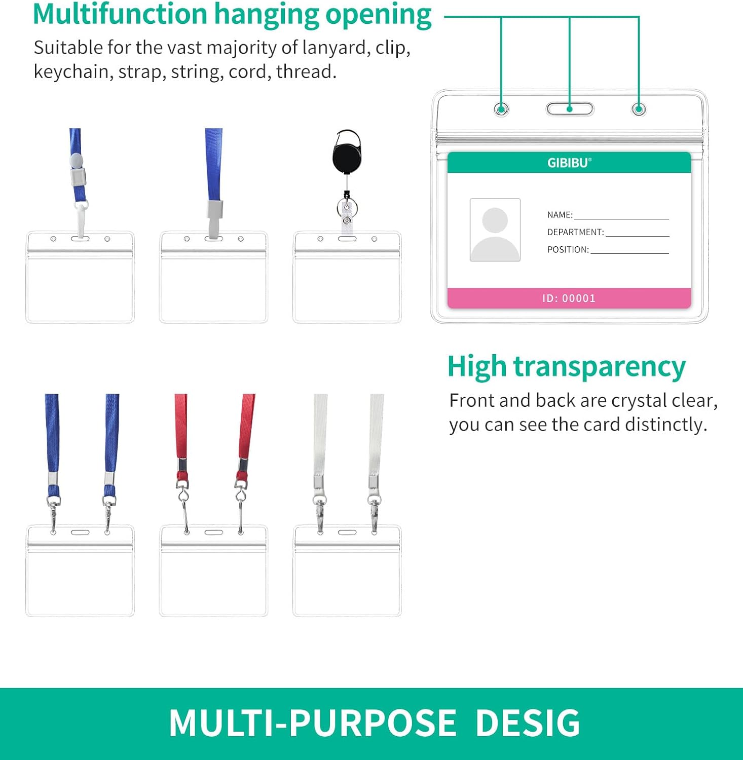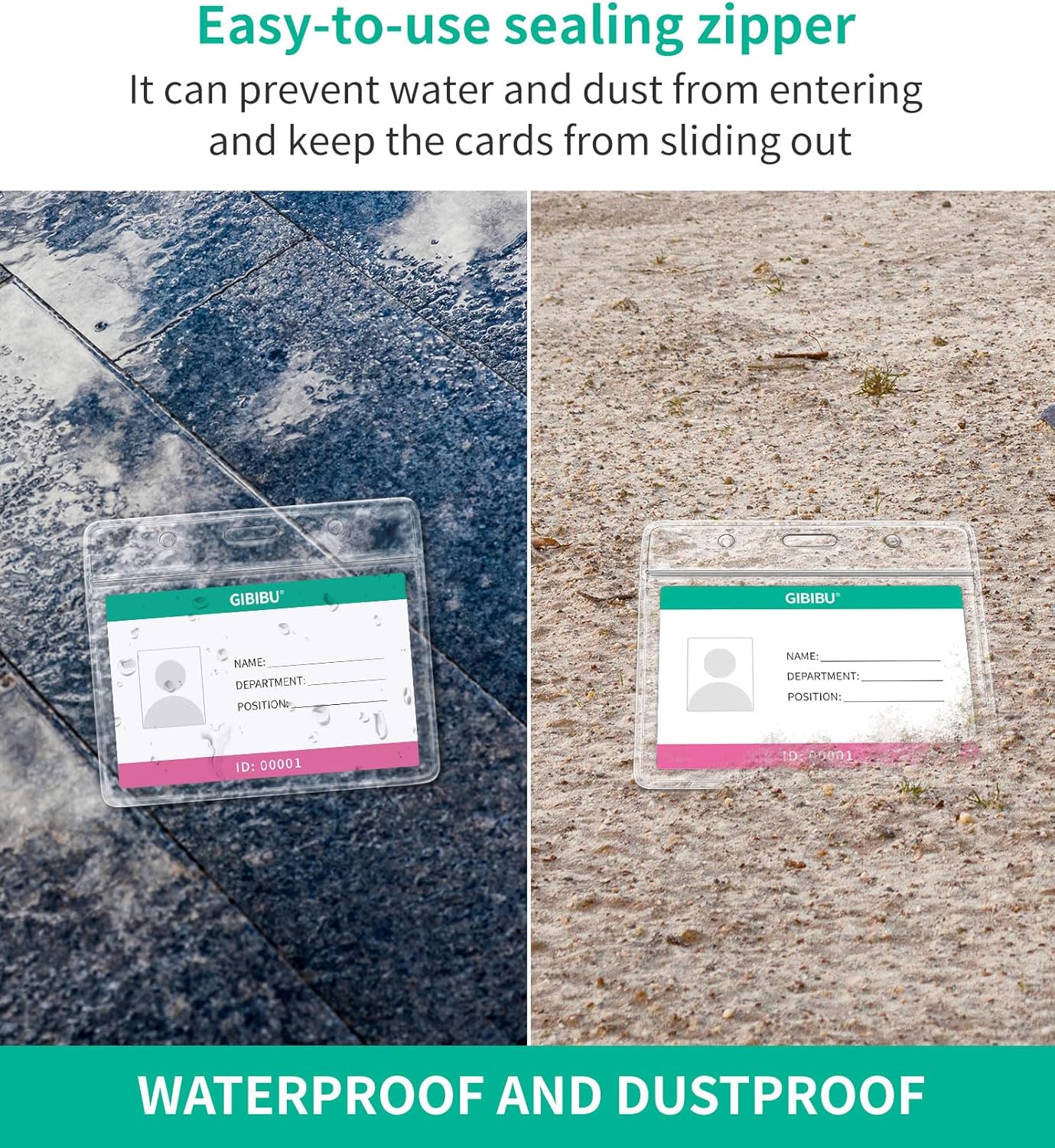 - MULTI-PURPOSE DESIG: Badge sleeve with zipper, waterproof and dustproof, keeps your cards and money safe and dry; Dual-use hanging design: the middle slot for lanyard, keychain, or retractable carabiner reel clip, the side holes for strap/string/cord/thread etc.