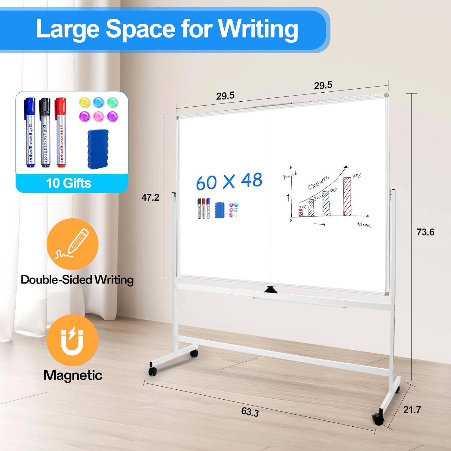 60 x 48 Double Sided Rolling Whiteboard, Large Rolling White Board - Magnetic Rolling Dry Erase Board Easel Standing Board on Wheels with Aluminium Frame for Office, Home & Classroom