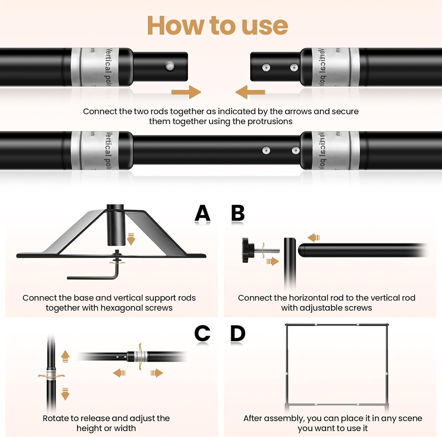 - 【Wide Application】The heavy duty backdrop stand is perfectly suitable for trade show, parties, conferences, promotion banner, weddings, birthday, baby shower, exhibitions, business events and so on. Photography backdrop stand can hang drapes, balloons to make your backdrop amazing, the carrying bag is convenient to store and transport it anywhere with you.