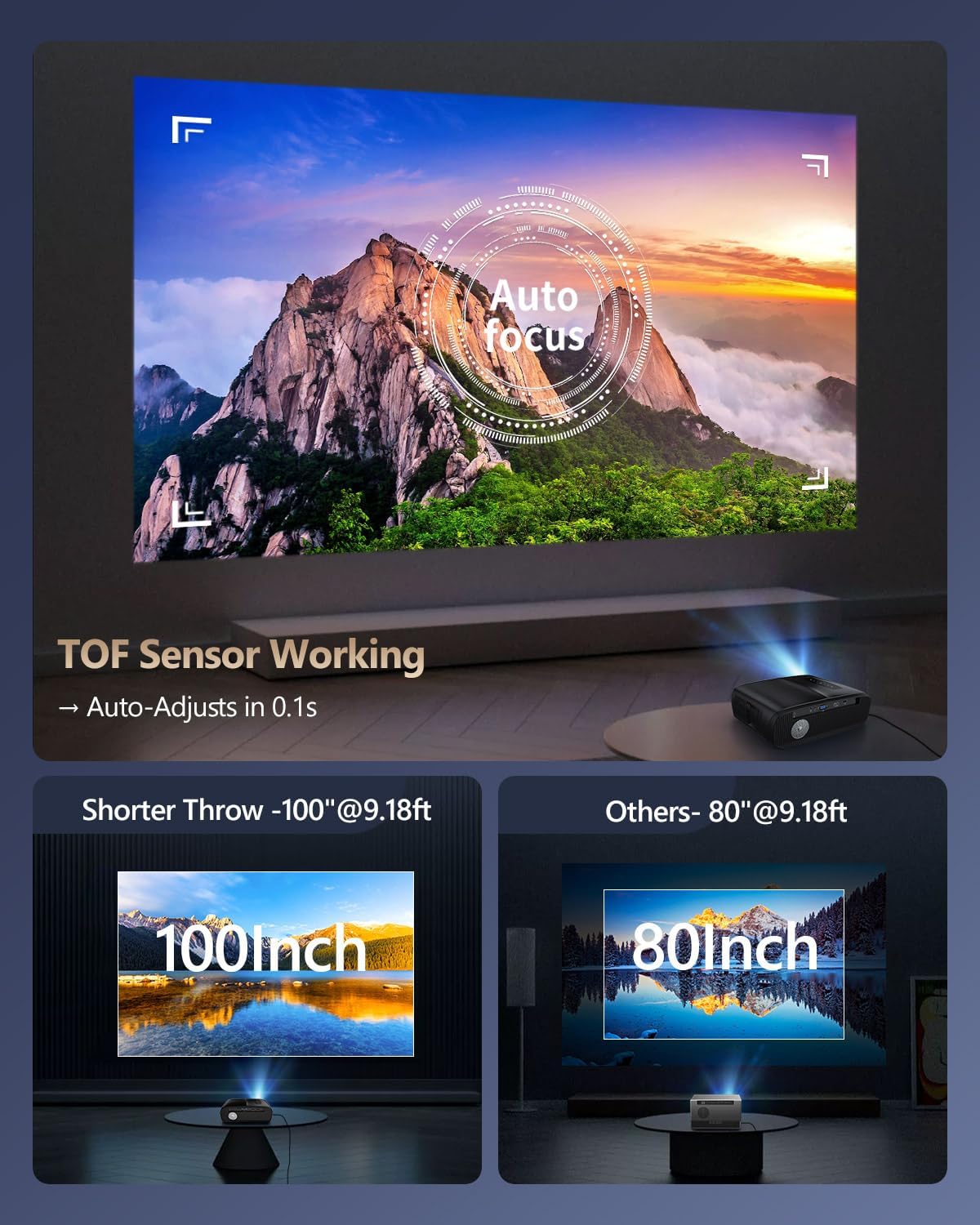 - [Smart Projection Reimagined] This 2025 updated projector combines space-defying short-throw optics to deliver a cinematic 100" display from just 9.18 feet, ideal for living rooms, apartments, or bedrooms. Powered by 3-in-1 CMOS module, its intelligent ToF technology achieves near-silent, instant auto-focus and keystone correction - operating 30% faster than conventional systems.