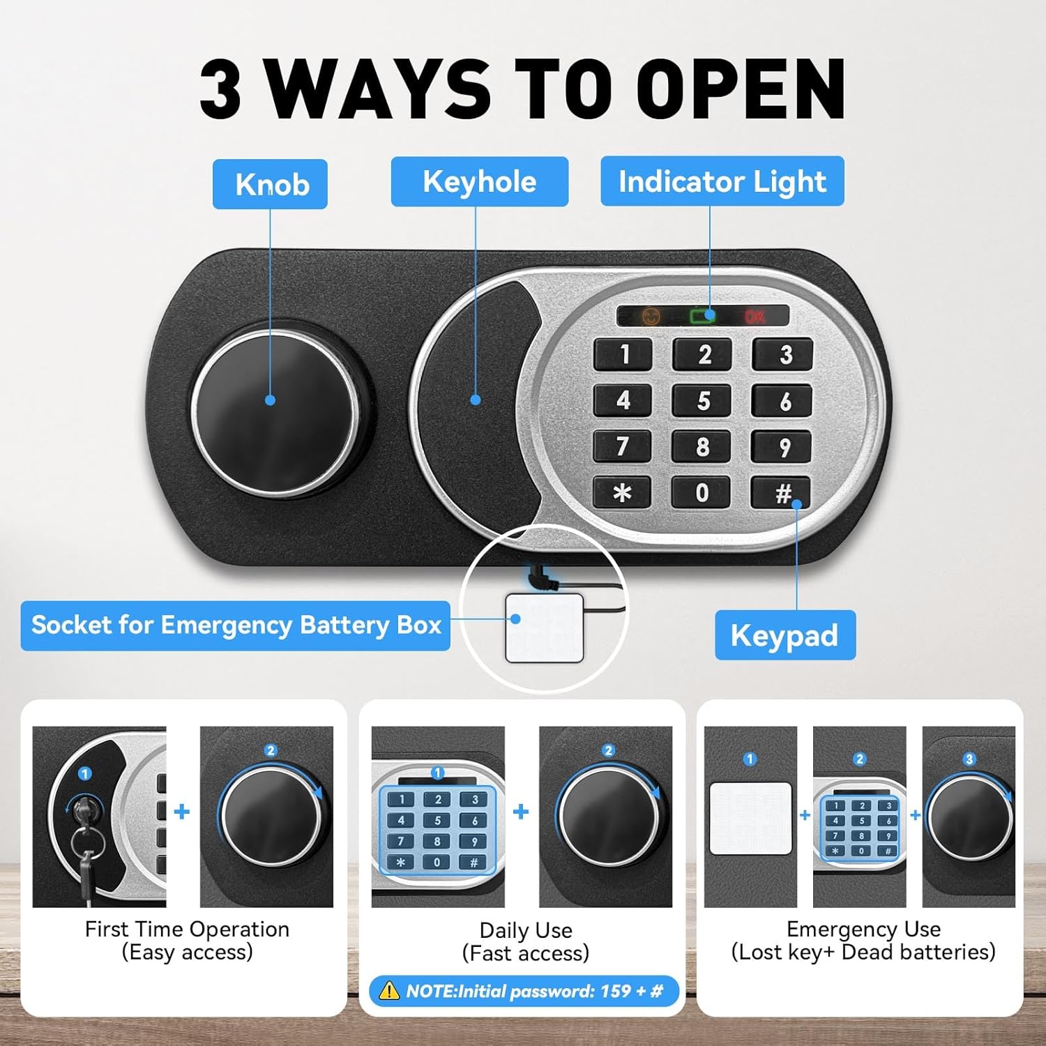 - Flexible Access Personal Safe: Open your safe three ways: ①Emergency key + knob (initial use), ② Personal code + knob, or ③ External battery + code+ knob. Remember: Never store backup keys inside safes for home use.