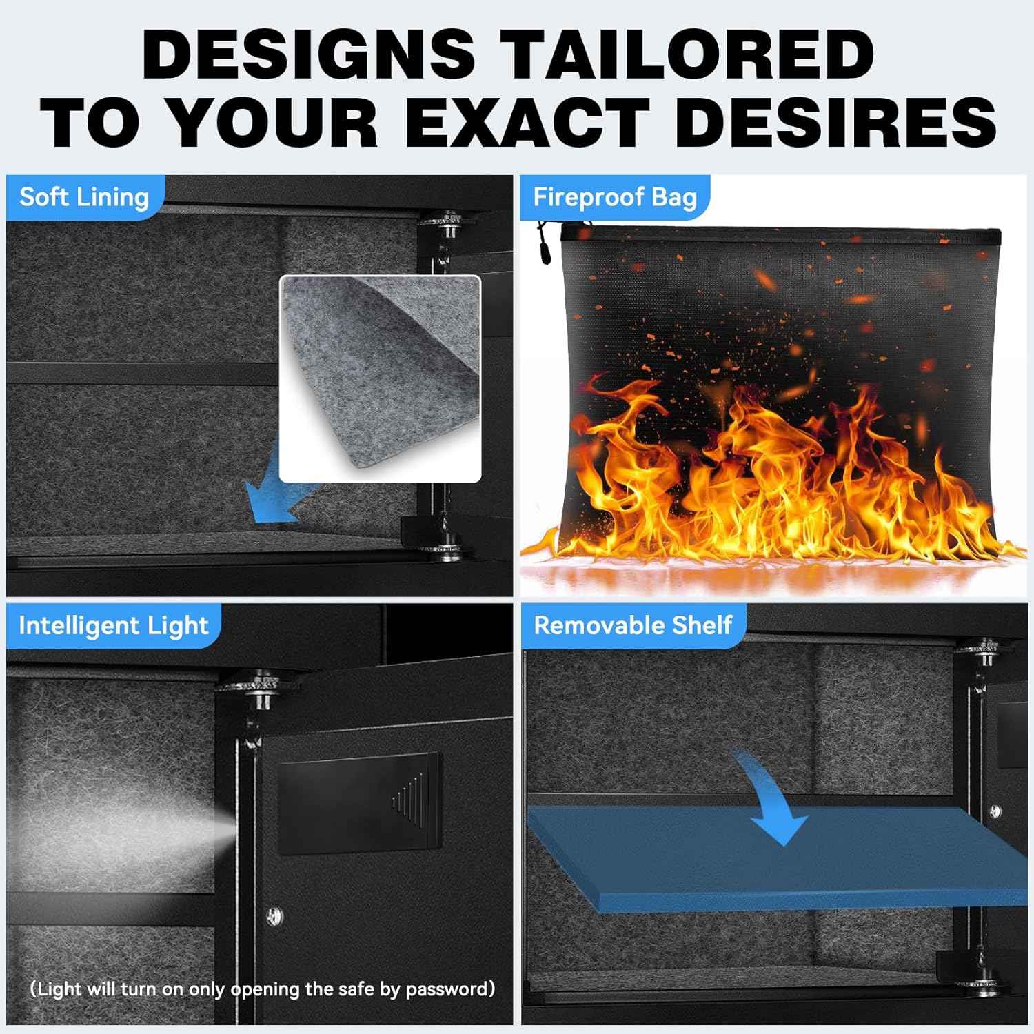 - FIREPROOF & WATERPROOF BAG and FULL COVERAGE LINING: Includes a basic fire and waterproof bag to safeguard documents and valuables during emergencies in a fire or a rainy day. The full-coverage soft lining in this safe box prevents scratches on delicate items like firearms and valuables.