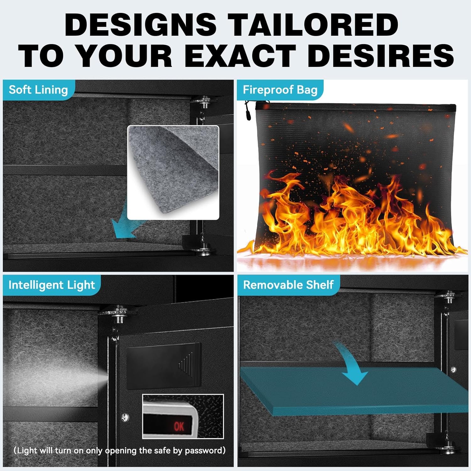 - REMOVABLE SHELVE & INTELLIGENT LIGHTING: Whether you want to create separate compartments or maximize the storage capacity, our removable shelf can offer the flexibility to adapt to your requirements; With the latest humanized lighting design, as soon as you open the lock box with your code, the light will light up for 30 seconds then slowly dims and goes out automatically, even in the dark, you can see the internal items.