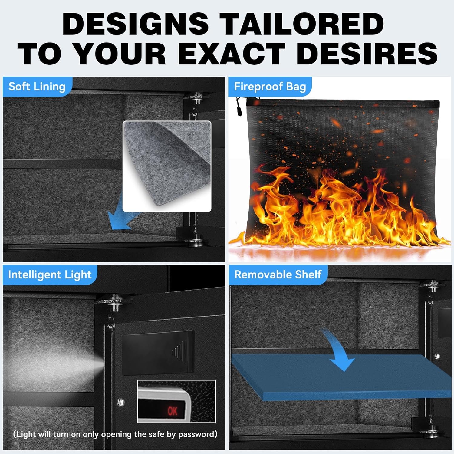 - FIREPROOF & WATERPROOF BAG and FULL COVERAGE LINING: Includes a basic fire and waterproof bag to safeguard documents and valuables during emergencies in a fire or a rainy day. The full-coverage soft lining in this safe box prevents scratches on delicate items like firearms and valuables.