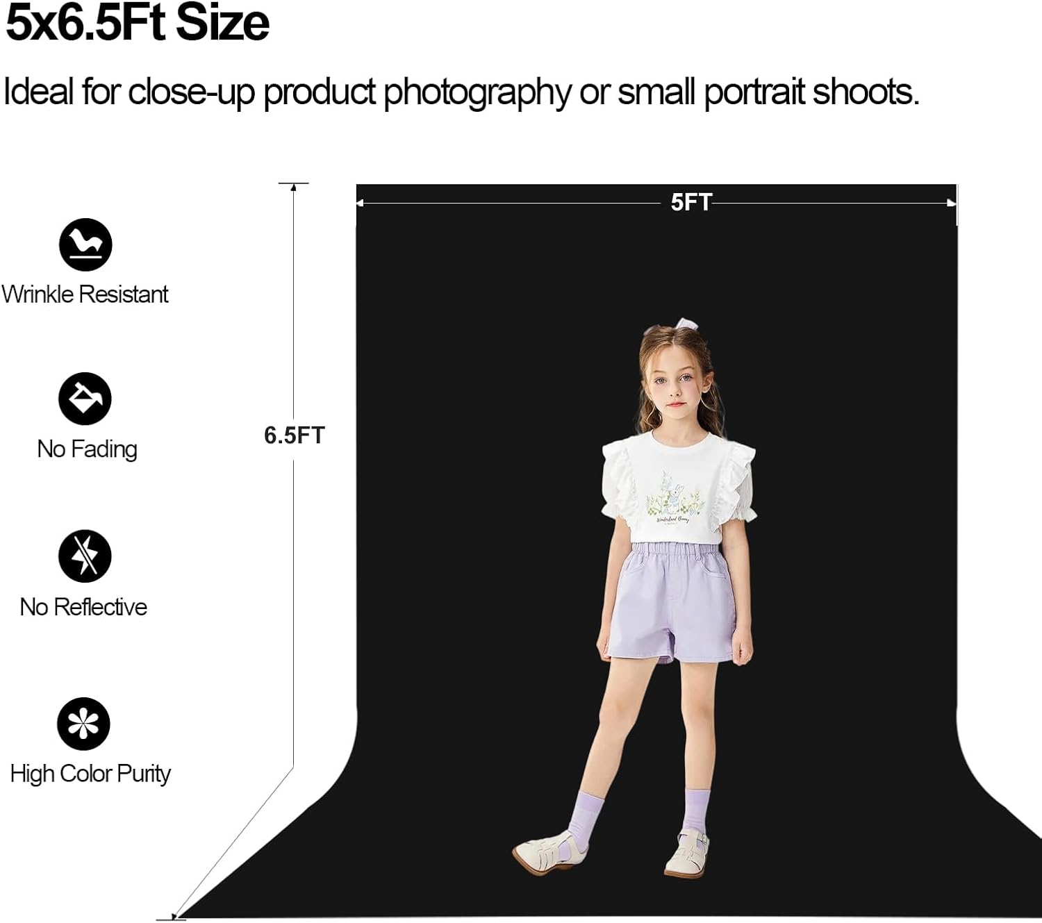 - 5X 6.5 FT BLACK BACKDROP: This chromakey black backdrop cloth is 5x6.5 ft in size, this black background can reduce the interference of the environment and make the subject more prominent. Please note: This package does not include the background stand