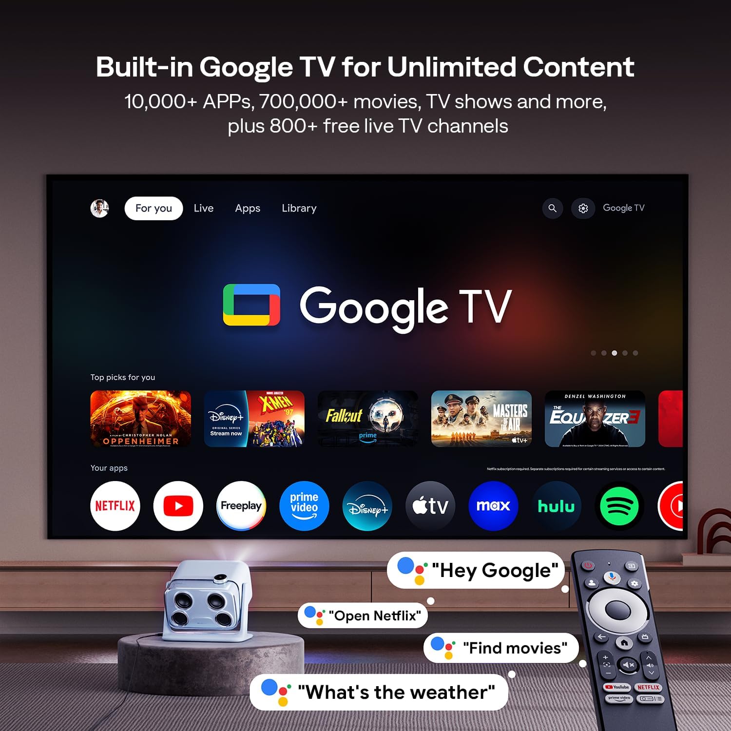 - Movie Projector - Smart Integration, Effortless Living: Seamlessly connect to the Google ecosystem with built-in Google TV, hands-free Google Assistant, and multi-device casting. Kids Mode manages screen time and filters content, creating a safer viewing experience. Stay effortlessly connected with smart home integration for the whole family.