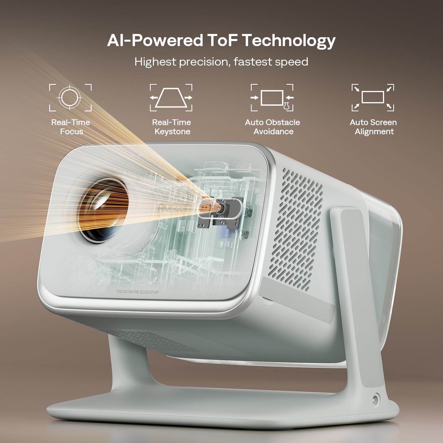 - Portable Projector - Always in Focus, Ready in 3 Seconds: Powered by advanced ToF technology, BOOM mini 4K projector delivers real-time auto focus and keystone correction in just 3 seconds—far faster than others in its class. Even if moved or bumped, it instantly readjusts, keeping visuals sharp and your experience uninterrupted. Ensure an immersive viewing experience.