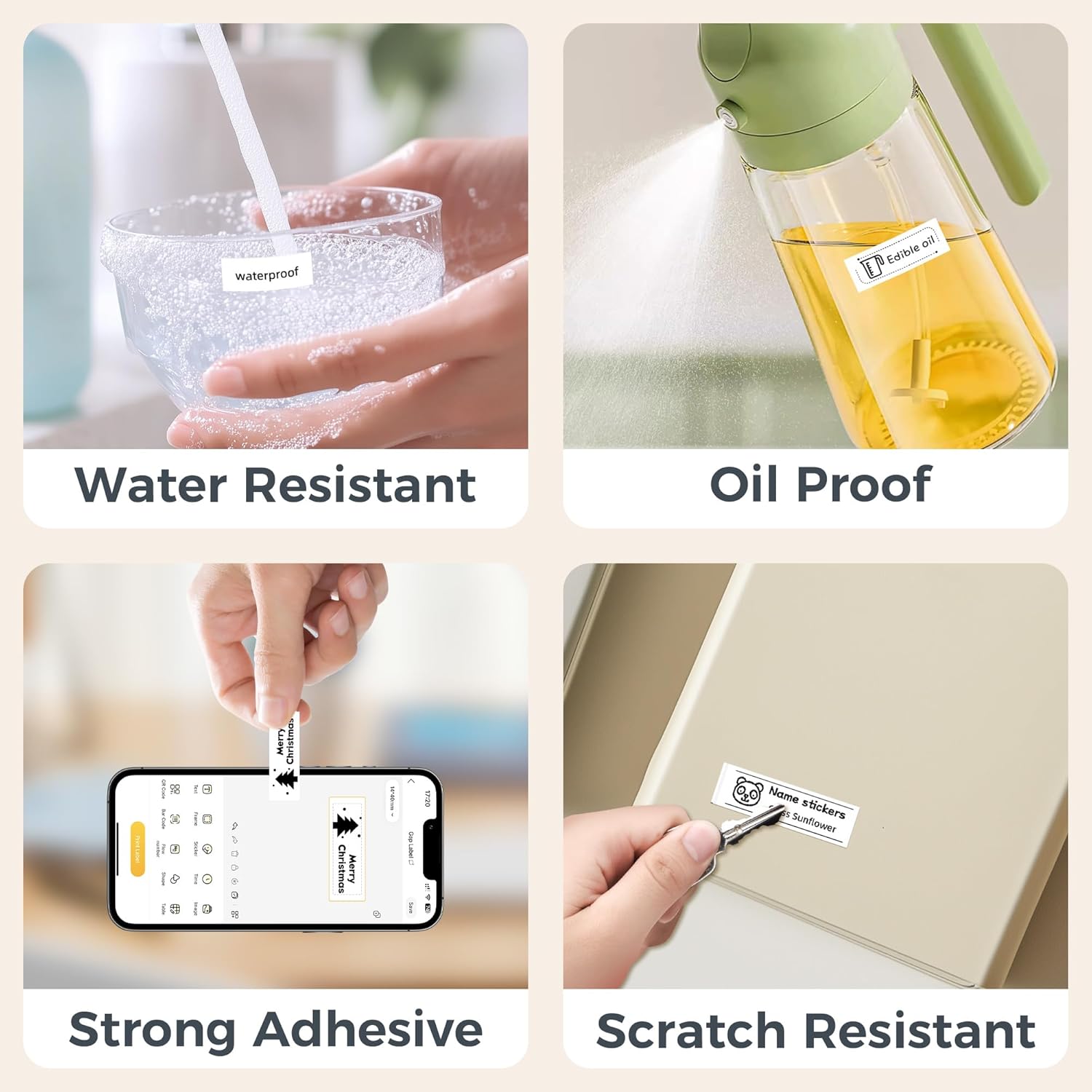 - Strong Adhesion: Our label maker tape features superior adhesive strength, securely bonding to various surfaces for long-lasting labels. Peel off easily without any residue. Exceptional Durability: Waterproof, oil-resistant, and