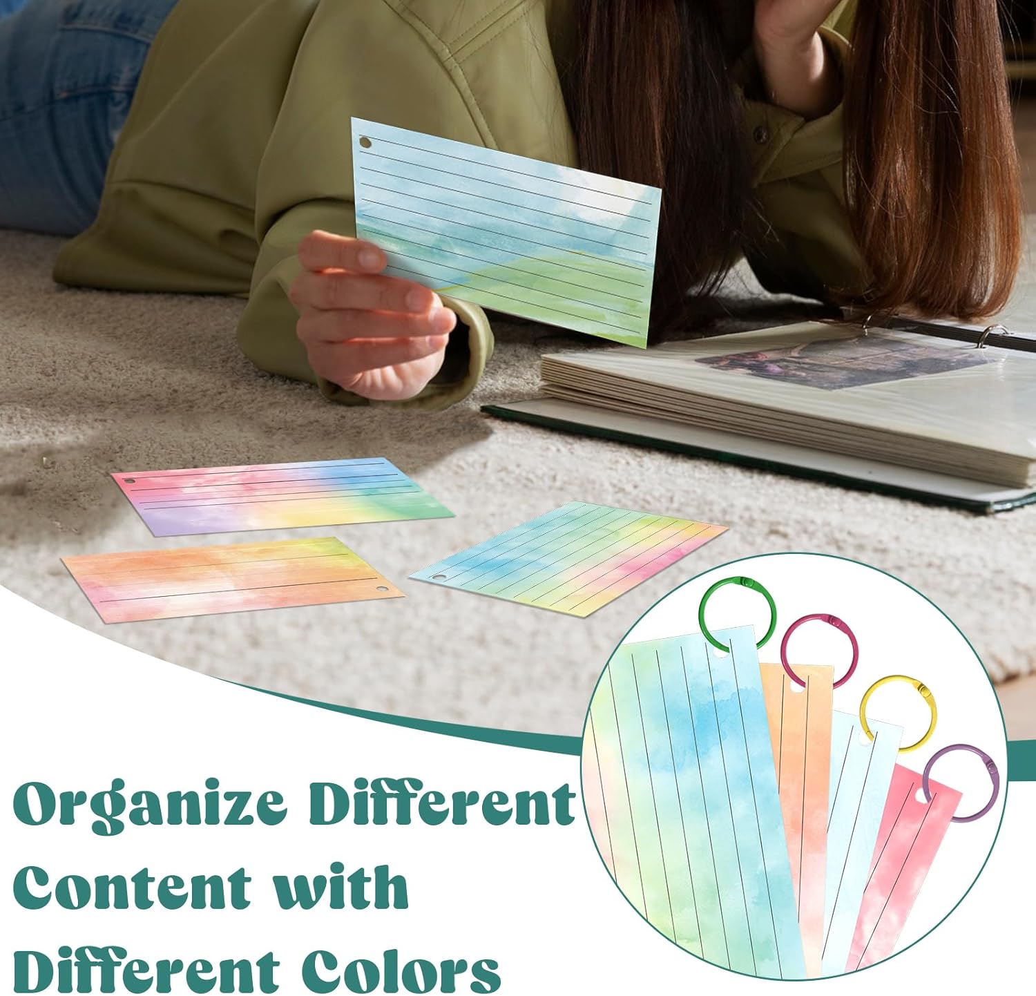 - Watercolor Design for Visual Delight:Our gradient watercolor index cards with rings feature a unique and exquisite gradient watercolor pattern design. Each ruled index card with hole resembles a miniature watercolor painting, adding an artistic touch to your study and workspace. The rich, layered colors make your notes and records more vibrant and engaging. Whether for study notes, work records, or capturing fleeting moments of inspiration, these cards are your ideal companions.